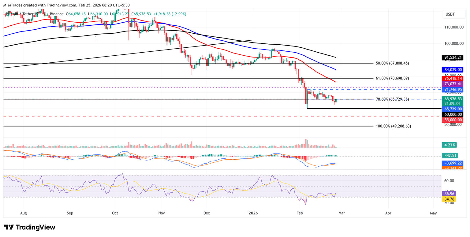 - El precio del Bitcoin se acerca al límite inferior de consolidación previamente roto en 65.729 $, el rechazo sugiere una corrección adicional por delante.