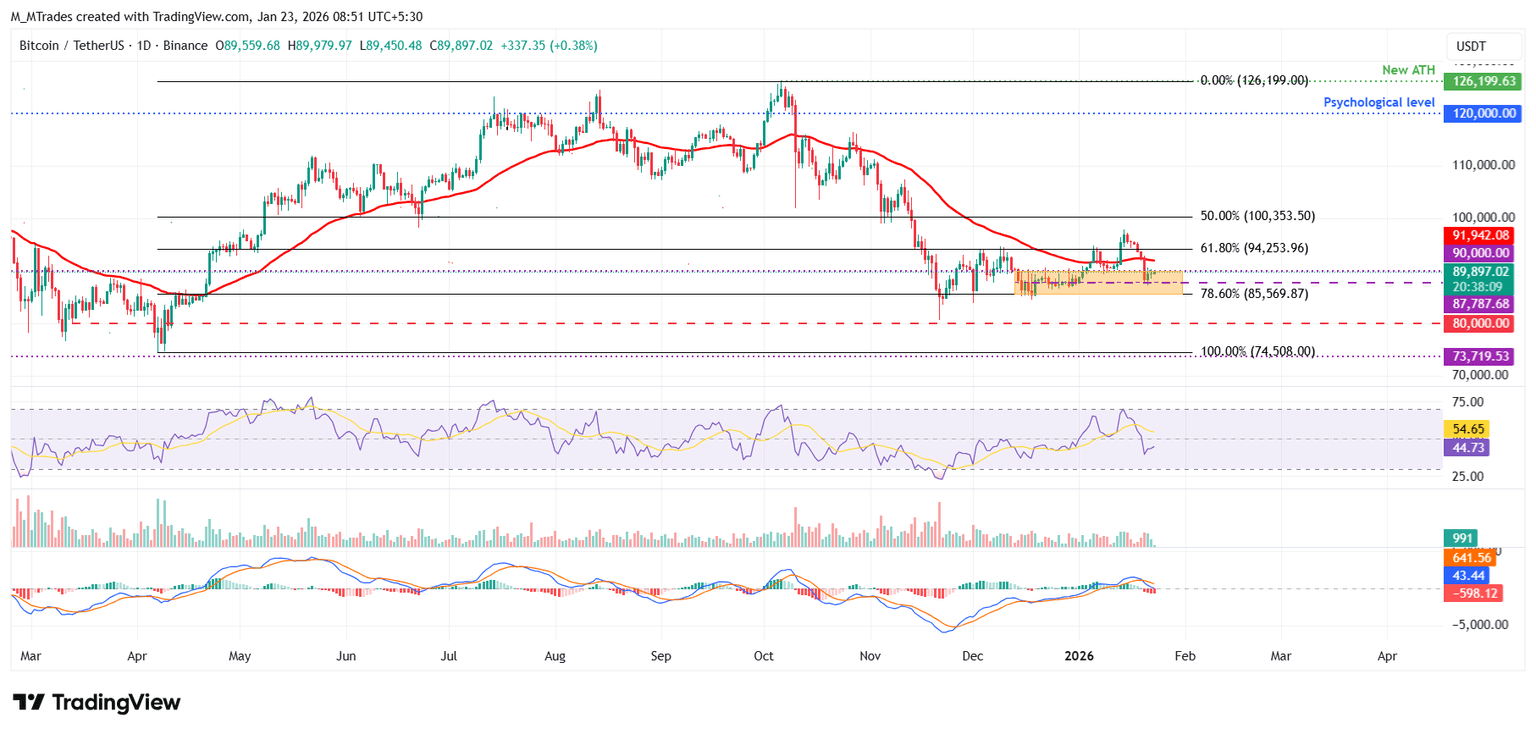 El precio del Bitcoin comenzó la semana en una nota negativa, cerrando por debajo de niveles de soporte clave: la media móvil exponencial (EMA) de 50 días en 91.942$ y el límite superior de consolidación previamente roto en 90.000$. El miércoles, BTC rebotó ligeramente tras volver a probar el punto medio de un canal paralelo horizontal en 87.787$ y continuó su recuperación al día siguiente. Al momento de escribir el viernes, BTC se cotiza alrededor de 89.900$.