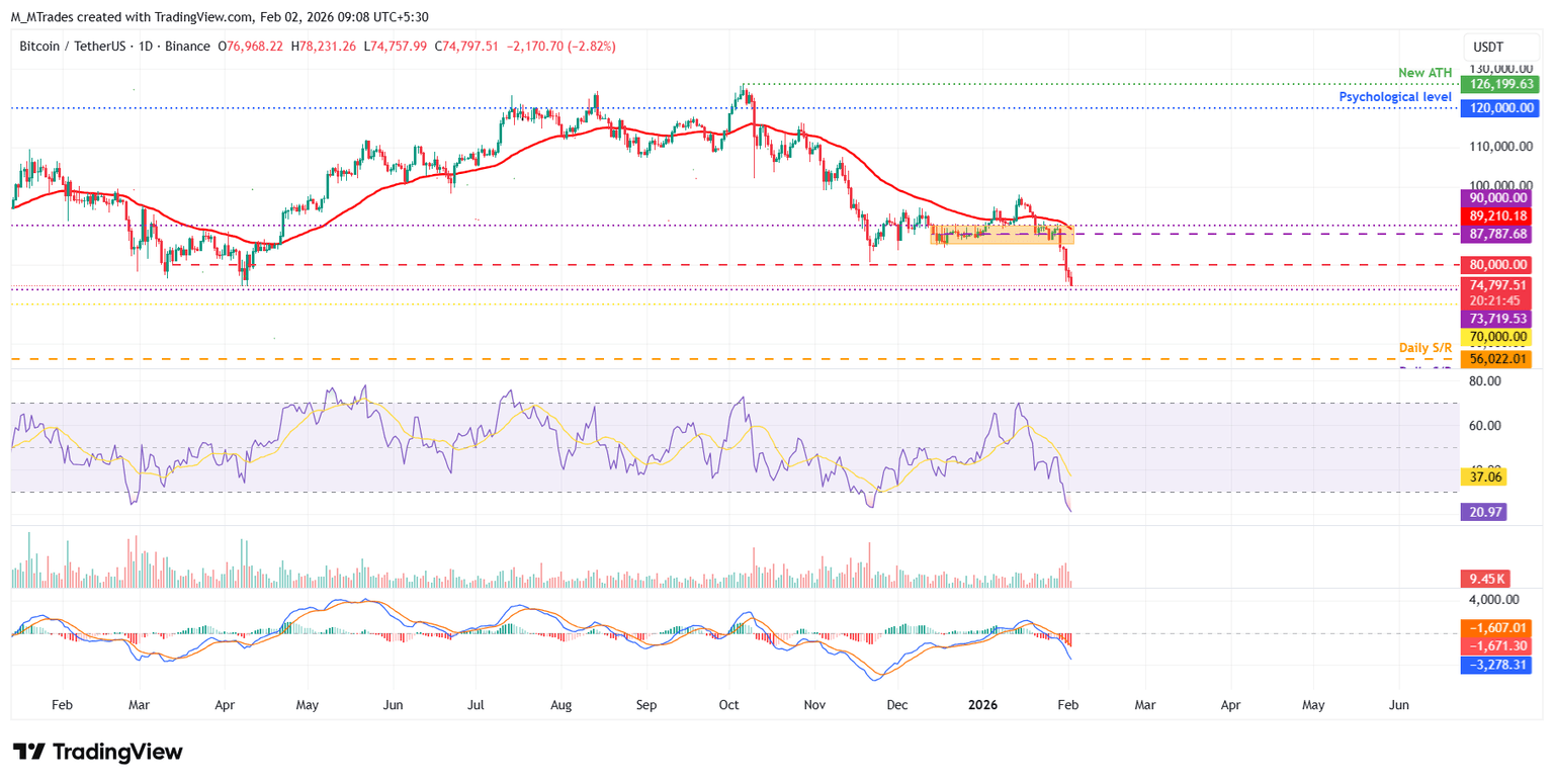 El precio del Bitcoin cerró por debajo del límite inferior del patrón de canal horizontal en 85.569$ el jueves y corrigió más del 9% hasta el domingo. Al momento de escribir el lunes, BTC cotiza a 74.800$.