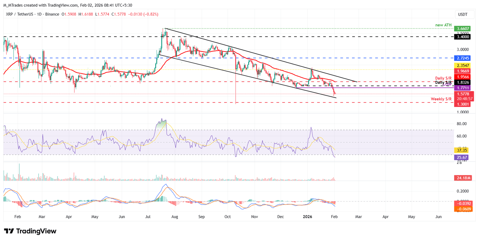- XRP cotiza a 1.59$ después de registrar cuatro velas semanales rojas consecutivas desde principios de enero.