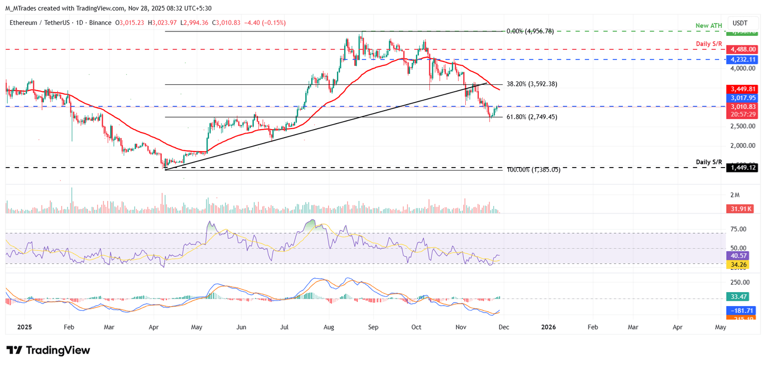 El precio de Ethereum encontró soporte cerca del nivel de retroceso de Fibonacci del 61.8% en 2.749$ el 22 de noviembre y se recuperó más de un 8% en los siguientes cuatro días. Al momento de escribir el viernes, ETH se acerca a su nivel de resistencia clave en 3.017$.