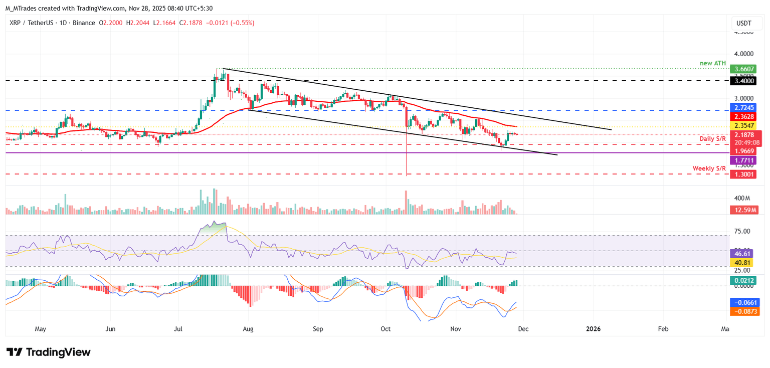 El precio de XRP volvió a probar y encontró soporte alrededor de la línea de tendencia inferior del canal descendente (dibujado conectando múltiples máximos y mínimos con dos líneas de tendencia) el sábado y se recuperó un 14.19% para el lunes. Sin embargo, XRP ha estado consolidándose alrededor del nivel de 2.20$ durante los últimos tres días. Al momento de escribir el viernes, se sitúa alrededor del mismo nivel.