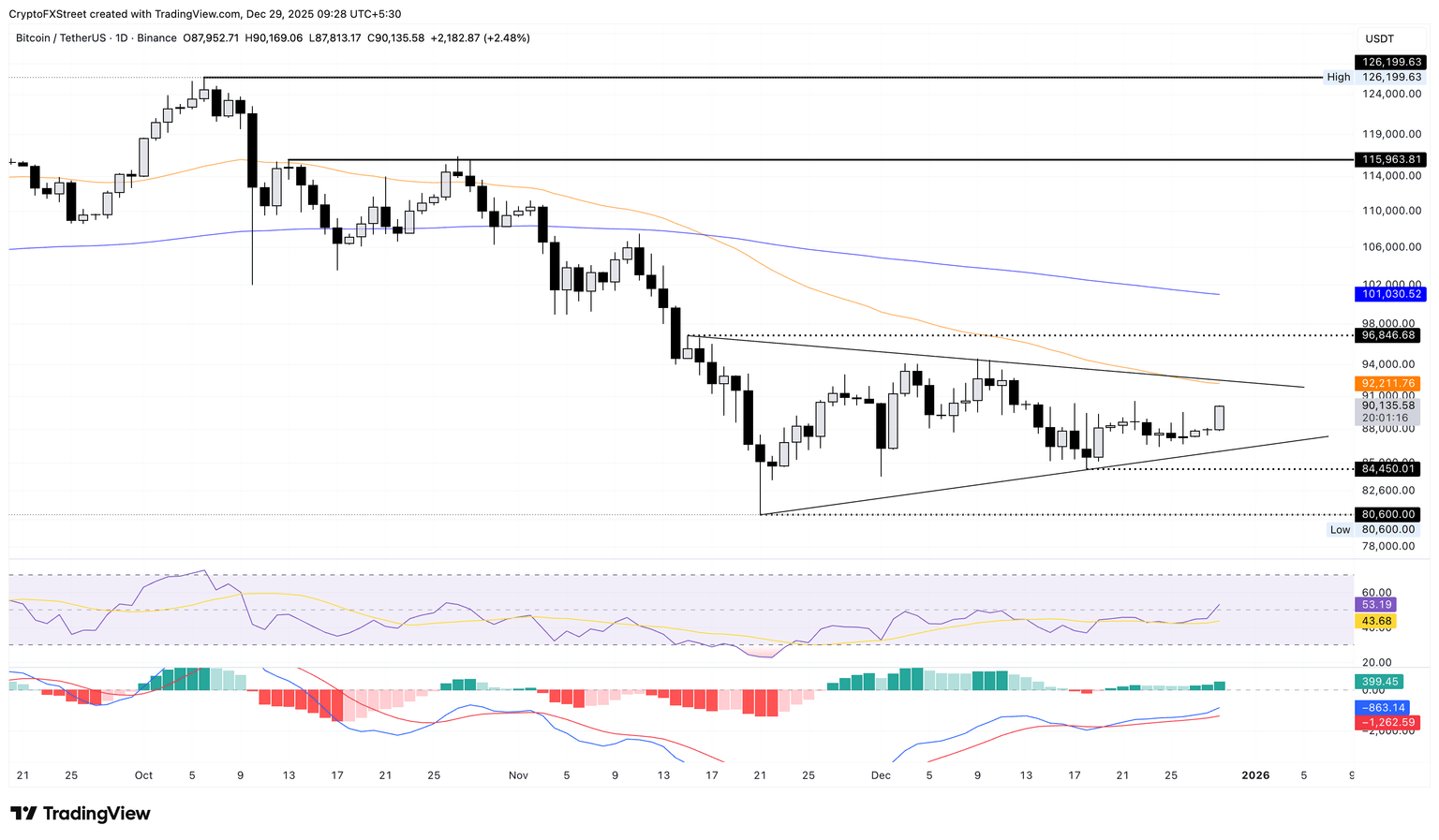 Además, el BTC se negocia dentro de un patrón de triángulo simétrico formado por dos líneas de tendencia convergentes en el gráfico diario. La línea de tendencia de resistencia superior cerca de la EMA de 50 días conecta los máximos del 15 de noviembre y del 9 de diciembre.