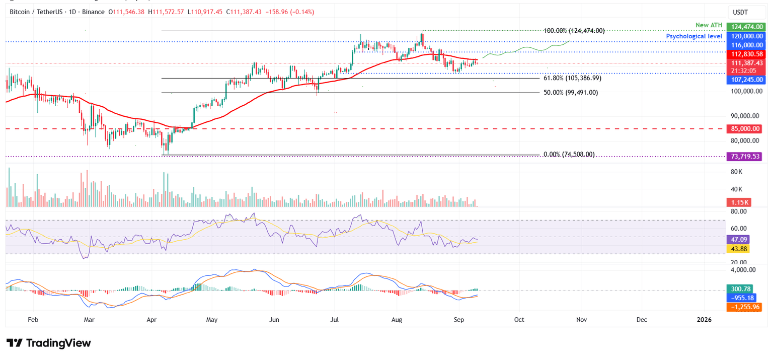 Si el BTC cierra por encima de la EMA de 50 días en 112.830$ de manera diaria, podría extender el rally hacia su próxima resistencia diaria en 116.000$.