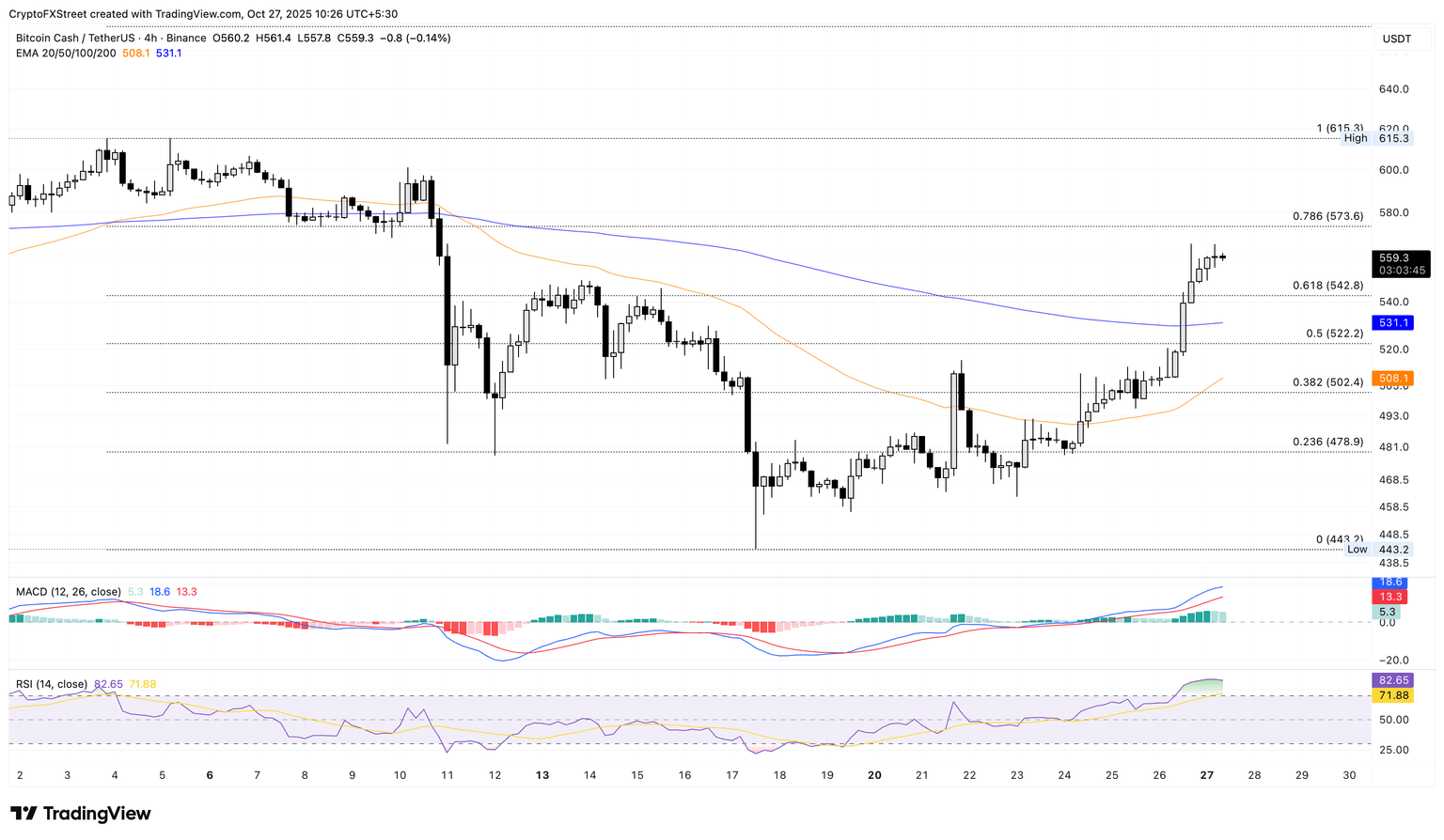 A medida que crece el interés de las ballenas, un empuje exitoso por encima de 573$ podría extender el repunte de BCH hasta el pico de 615$ del 3 de octubre.
