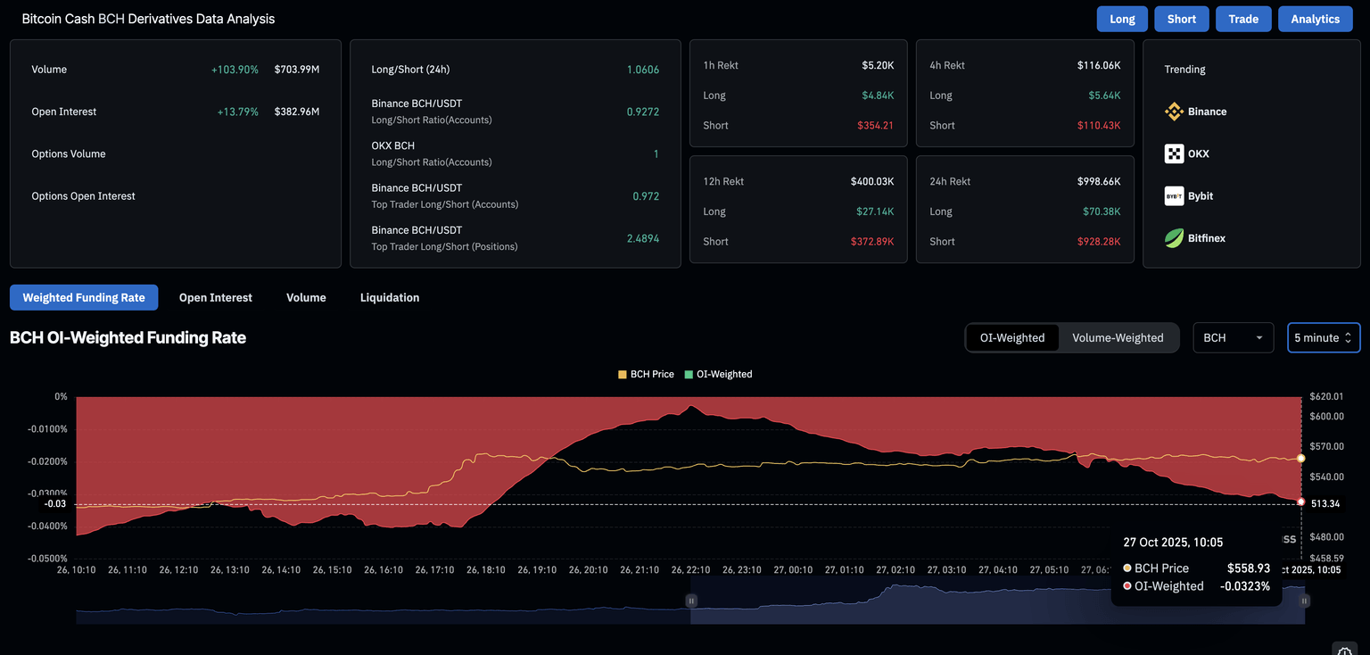 En línea con la alta demanda, los datos de CoinGlass muestran un aumento del 13.8% en el Interés Abierto (OI) de futuros de BCH en las últimas 24 horas, llevándolo a 382.96 millones de dólares. Un aumento en el OI de futuros sugiere un sentimiento de riesgo entre los operadores a medida que el valor nocional de las posiciones largas pendientes aumenta.