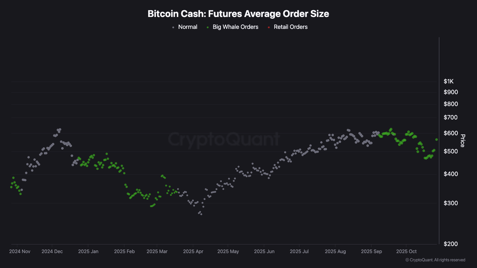El mercado de derivados ve un aumento en la demanda de Bitcoin Cash a medida que los operadores capitalizan el cambio repentino en el sentimiento del mercado. Los datos de CryptoQuant indican que los operadores de grandes bolsillos, conocidos popularmente como ballenas, están realizando grandes órdenes en futuros de Bitcoin Cash. Típicamente, un aumento en la actividad de las ballenas en el mercado de futuros presagia un repunte en el precio.