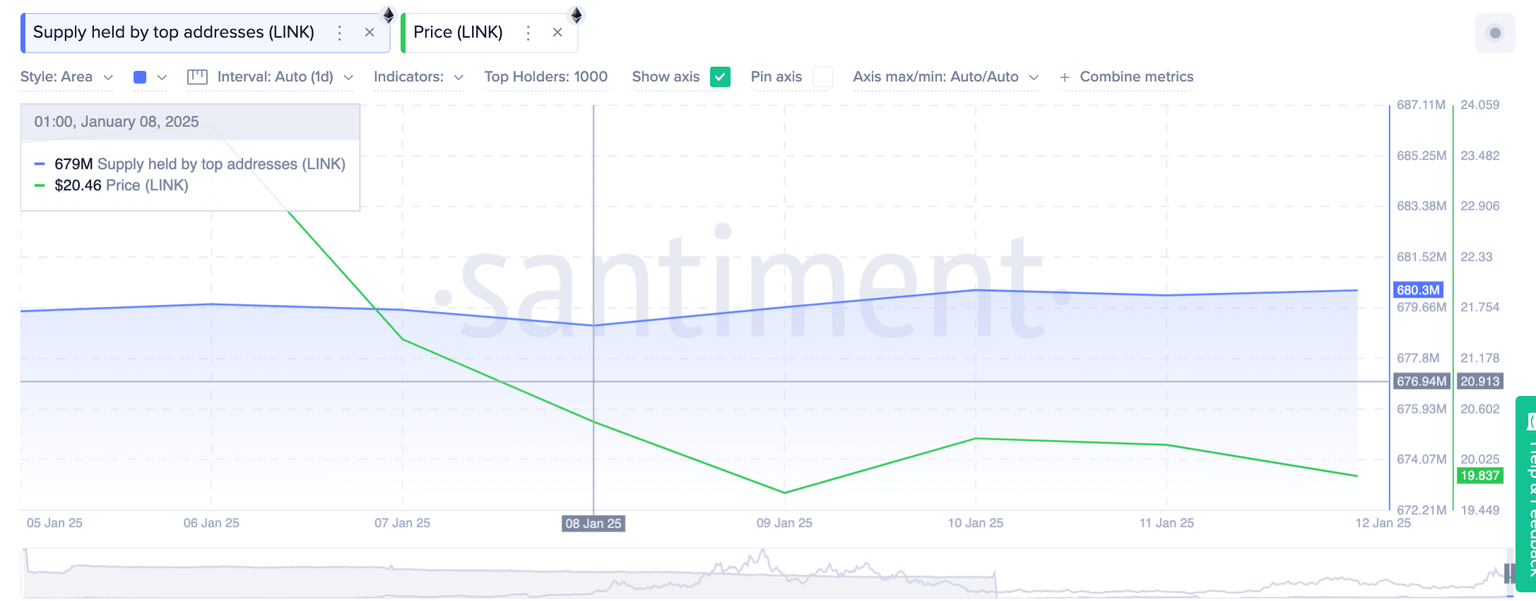 El gráfico de Santiment, mostrado a continuación, rastrea los saldos mantenidos por las 1.000 carteras más grandes en la red blockchain de Chainlink.