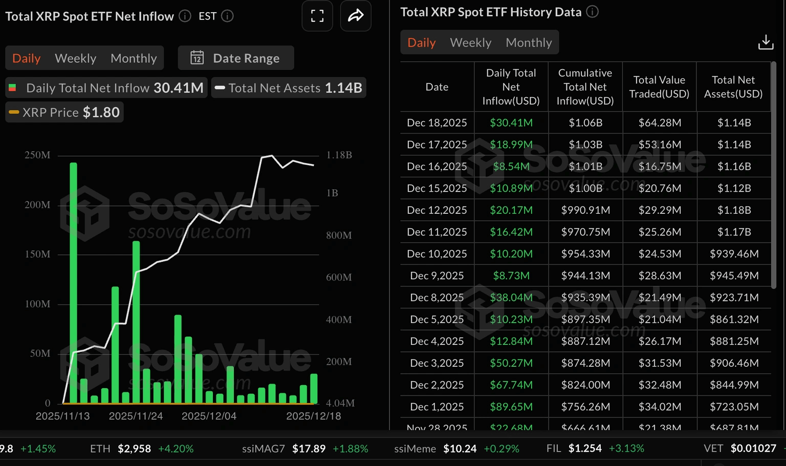 Ripple (XRP) ha subido más del 3%, cotizando a 1.87$ en el momento de escribir el viernes. XRP recupera impulso, tras una acción de precios volátil que lo llevó a un mínimo intradía de 1.77$, apoyándose en un índice de precios al consumidor (IPC) de Estados Unidos más suave, que aumentó un 2.7% anual en noviembre, más lento que las estimaciones de los analistas del 3.1%.