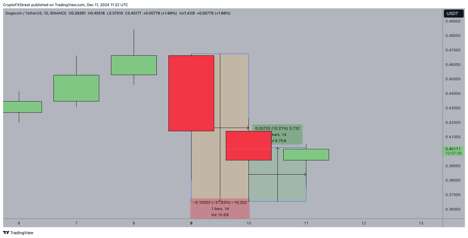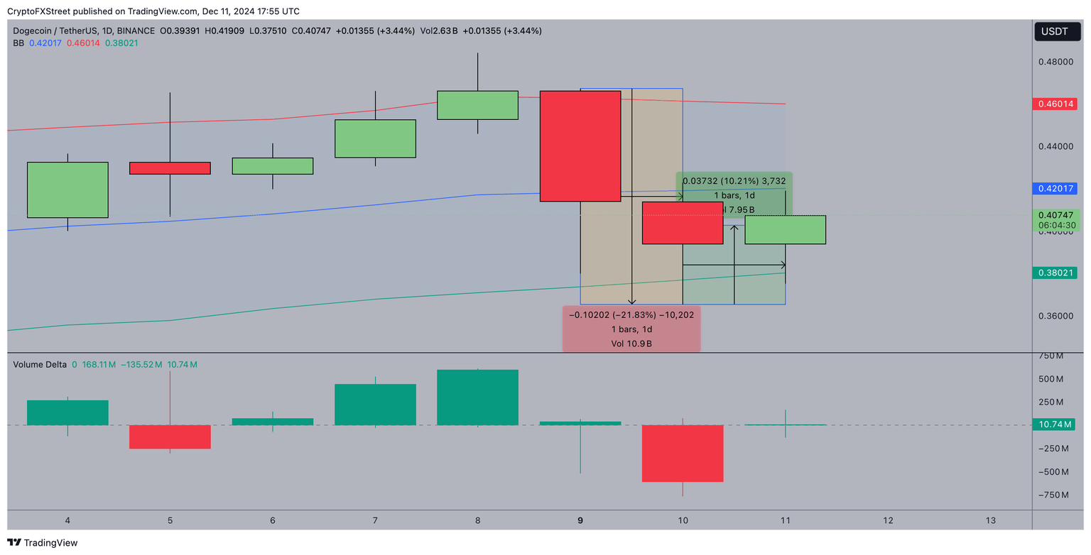El gráfico anterior muestra cómo el precio de DOGE ha subido un 10,2% al alcanzar un máximo de 0,41 $ el miércoles. Este impresionante rebote revierte efectivamente casi la mitad de las pérdidas del 21,8% registradas cuando los precios cayeron a un mínimo de 20 días de 0,36 $ el martes.