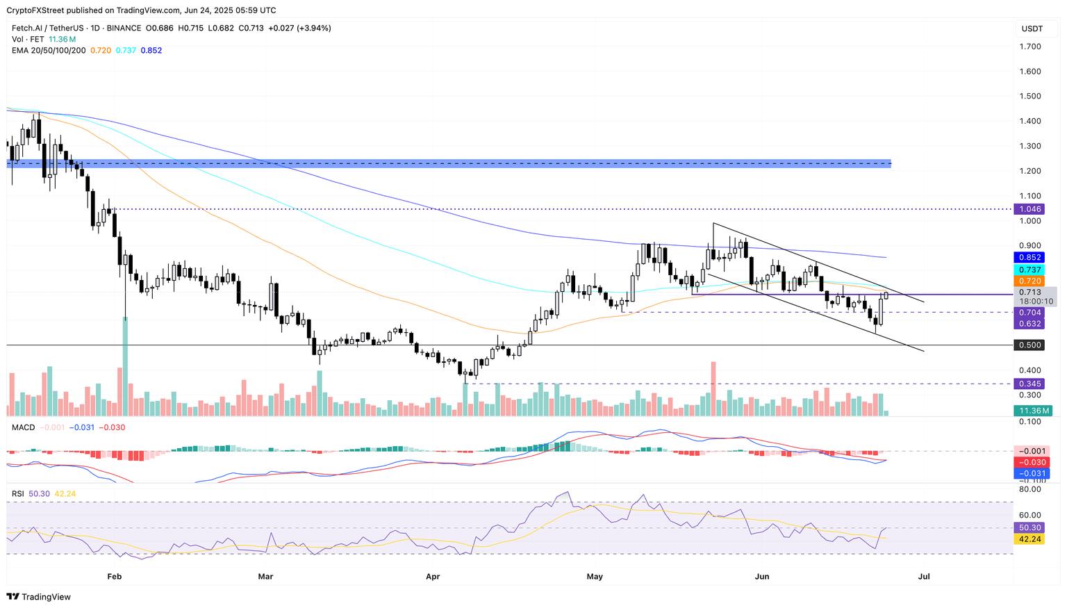 FET avanza un 3% en el momento de la publicación el martes, construyendo sobre el aumento del 17% visto el lunes. La recuperación del token de IA apunta a las medias móviles exponenciales (EMA) de 50 días y 100 días en 0.72$.