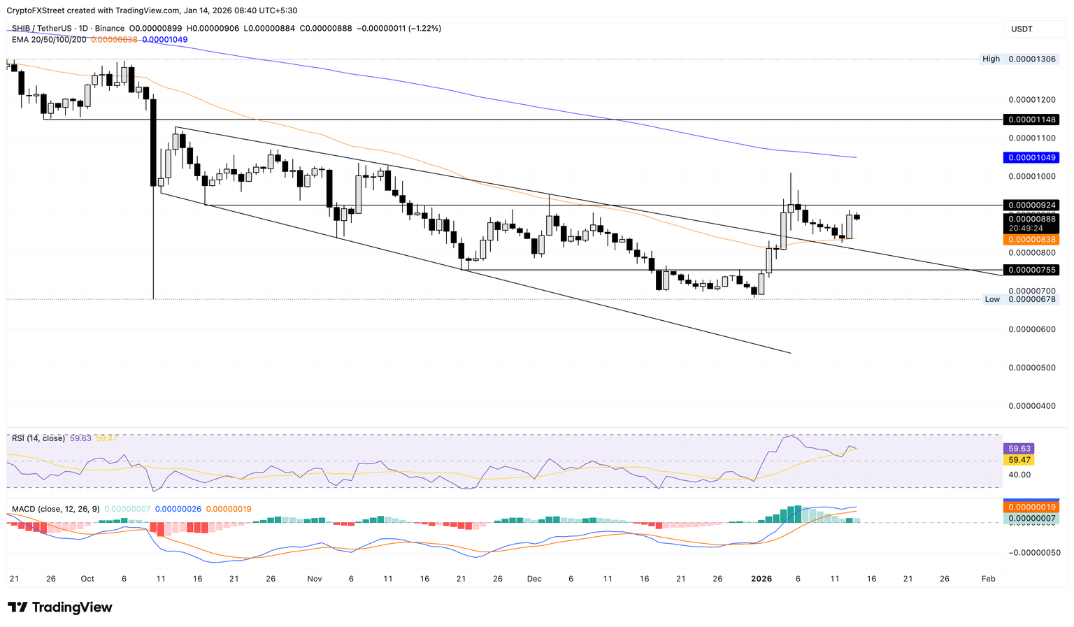 - Shiba Inu toma un respiro tras un rebote del 7% el martes desde la EMA de 50 días.