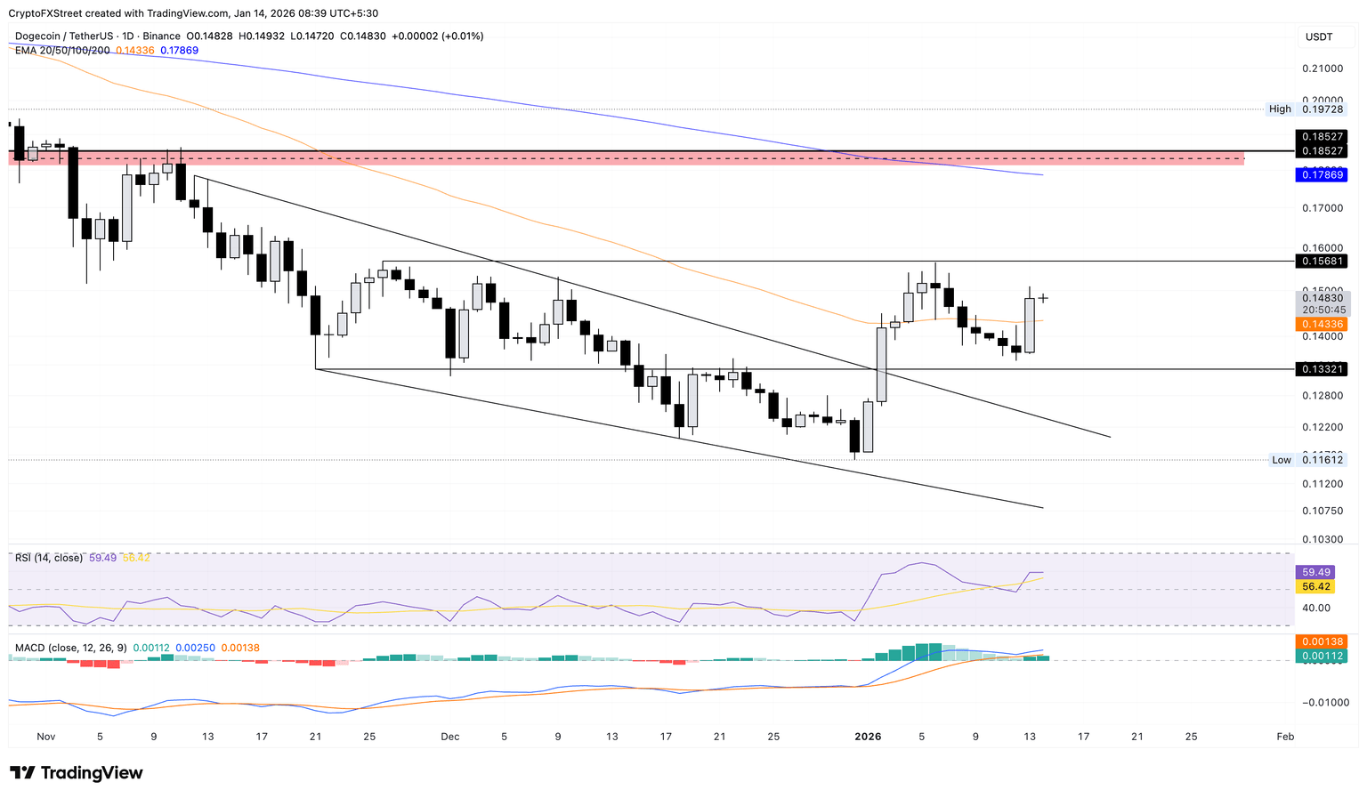 Si DOGE retrocede desde 0.1500$, podría volver a probar el soporte de 0.1332$ marcado por el mínimo del 21 de noviembre.