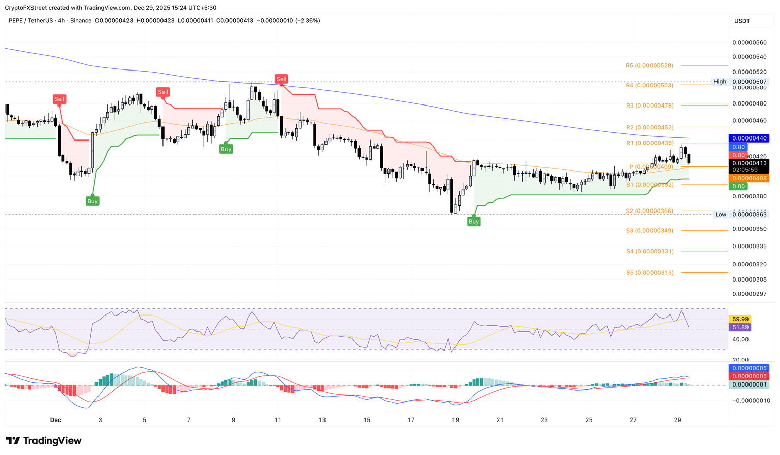 Pepe se mantiene por encima de 0.00000400$ en el momento de la redacción el lunes, manteniendo una tendencia de recuperación general, según el indicador Supertrend en el gráfico de 4 horas. La moneda meme con temática de rana extiende una reversión desde cerca del Punto Pivote R1 en 0.00000435$, arriesgando una nueva prueba del Punto Pivote central en 0.00000409$.