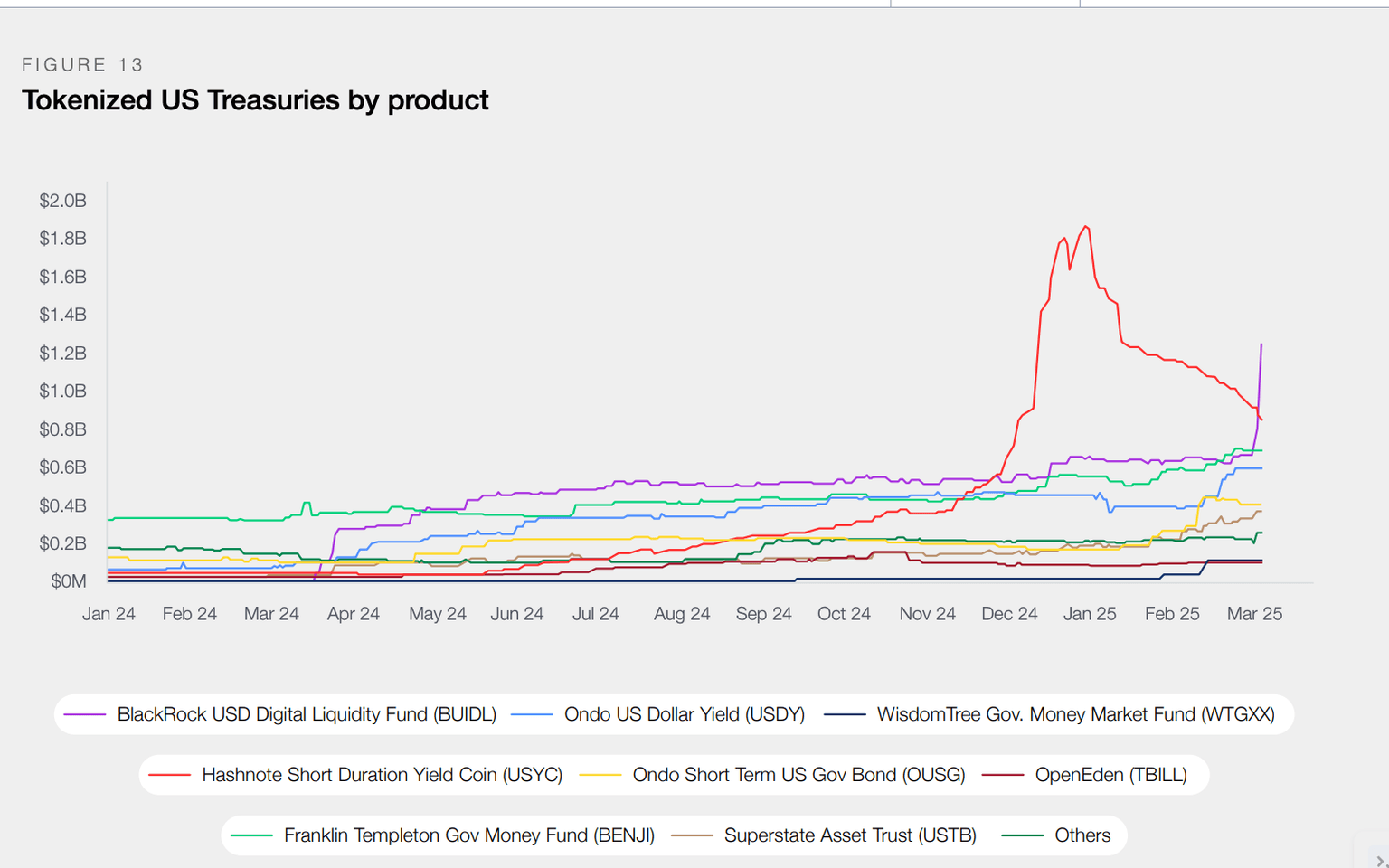 Otras entidades que ofrecen acceso a fondos del tesoro en EE.UU. incluyen Ondo Finance, Hashnote y CoinShares. Hay otras ofertas de nicho, como proyectos de repos de bonos del tesoro tokenizados, que apoyan la liquidación y el comercio las 24 horas. La plataforma Onyx de JP Morgan es un ejemplo de esta clase de activos, utilizando tecnología blockchain para ofrecer bonos del tesoro tokenizados respaldados por soluciones de repos.