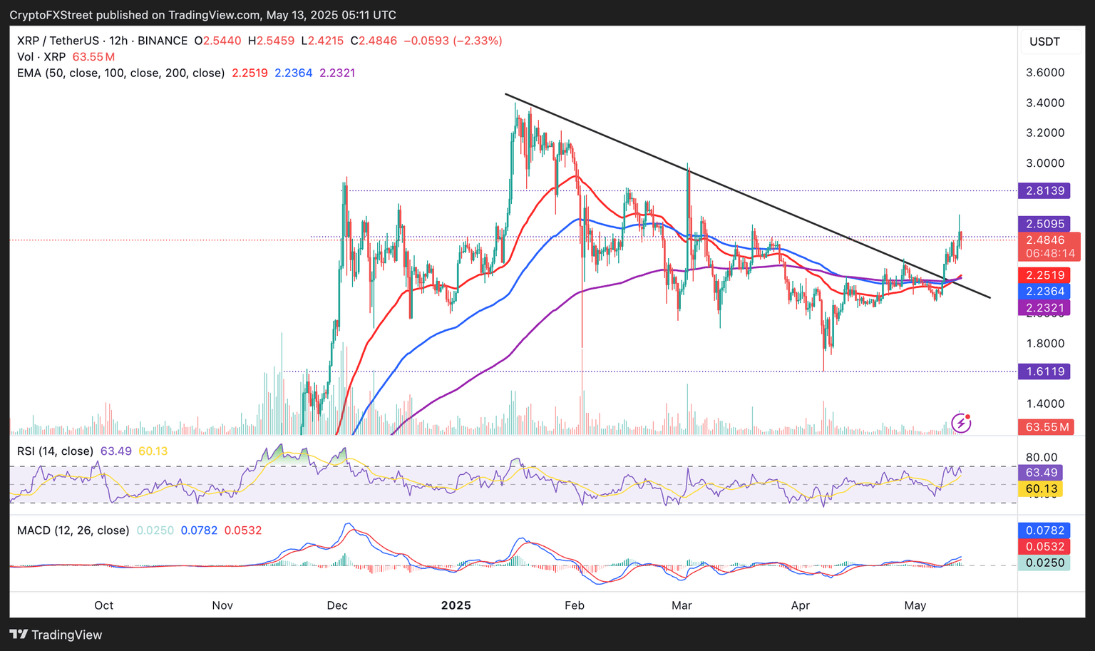Basado en el gráfico de 12 horas, XRP se sitúa significativamente por encima de las medias móviles clave, incluyendo la media móvil exponencial (EMA) de 50, 100 y 200, formando un soporte de confluencia alrededor de 2.23$.