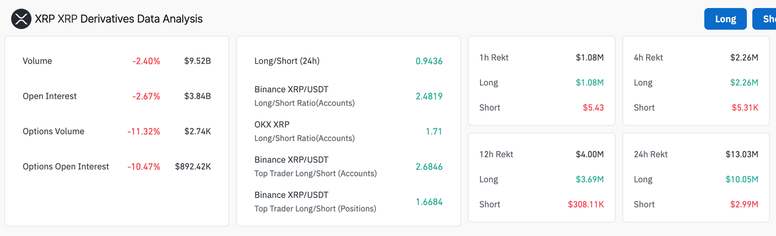 El precio de XRP se sitúa en 2.14$ en el momento de escribir, reflejando un sentimiento bajista en el mercado de criptomonedas en general. Según los datos del mercado de derivados de Coinglass, el Interés Abierto (OI) de XRP ha disminuido un 2.67% a 3.840 millones de dólares en las últimas 24 horas. Esta caída en el precio de XRP provocó liquidaciones en el último día, donde las posiciones largas valoradas en 10.05 millones de dólares fueron cerradas forzosamente, en comparación con aproximadamente 3 millones en posiciones cortas.