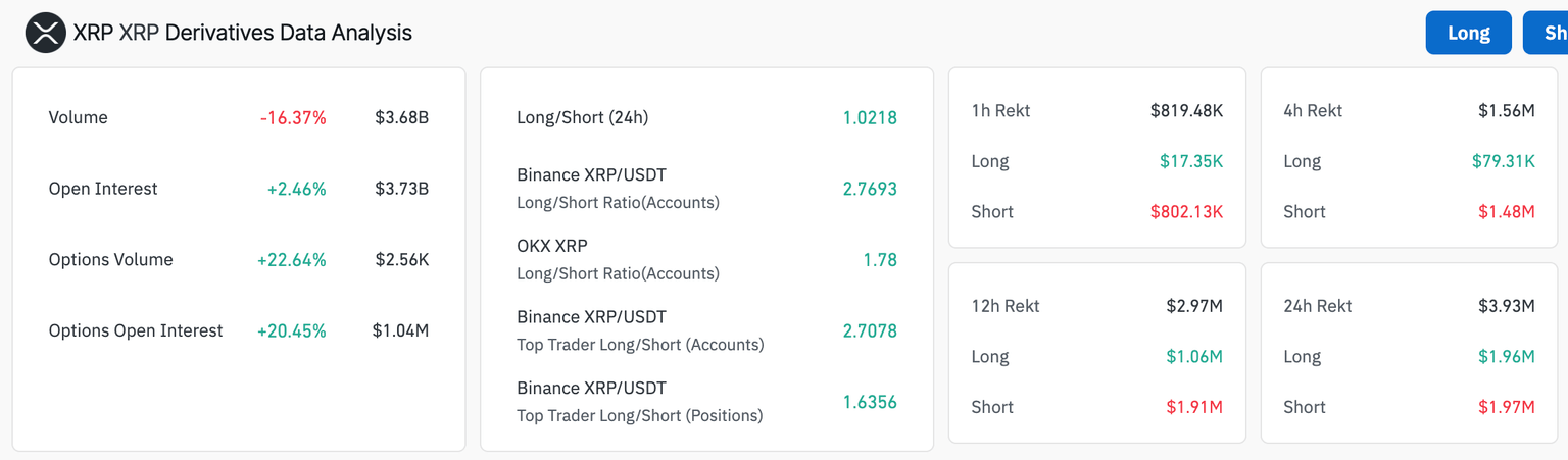 Un aumento del 2.46% en el interés abierto (OI) indica un renovado interés en la tendencia alcista de XRP a medida que nuevo capital ingresa al mercado. De manera similar, el OI de opciones se disparó un 20.45% a 1 millón de dólares en las últimas 24 horas, impulsando la narrativa alcista en medio de una mayor actividad especulativa y participación de los comerciantes.