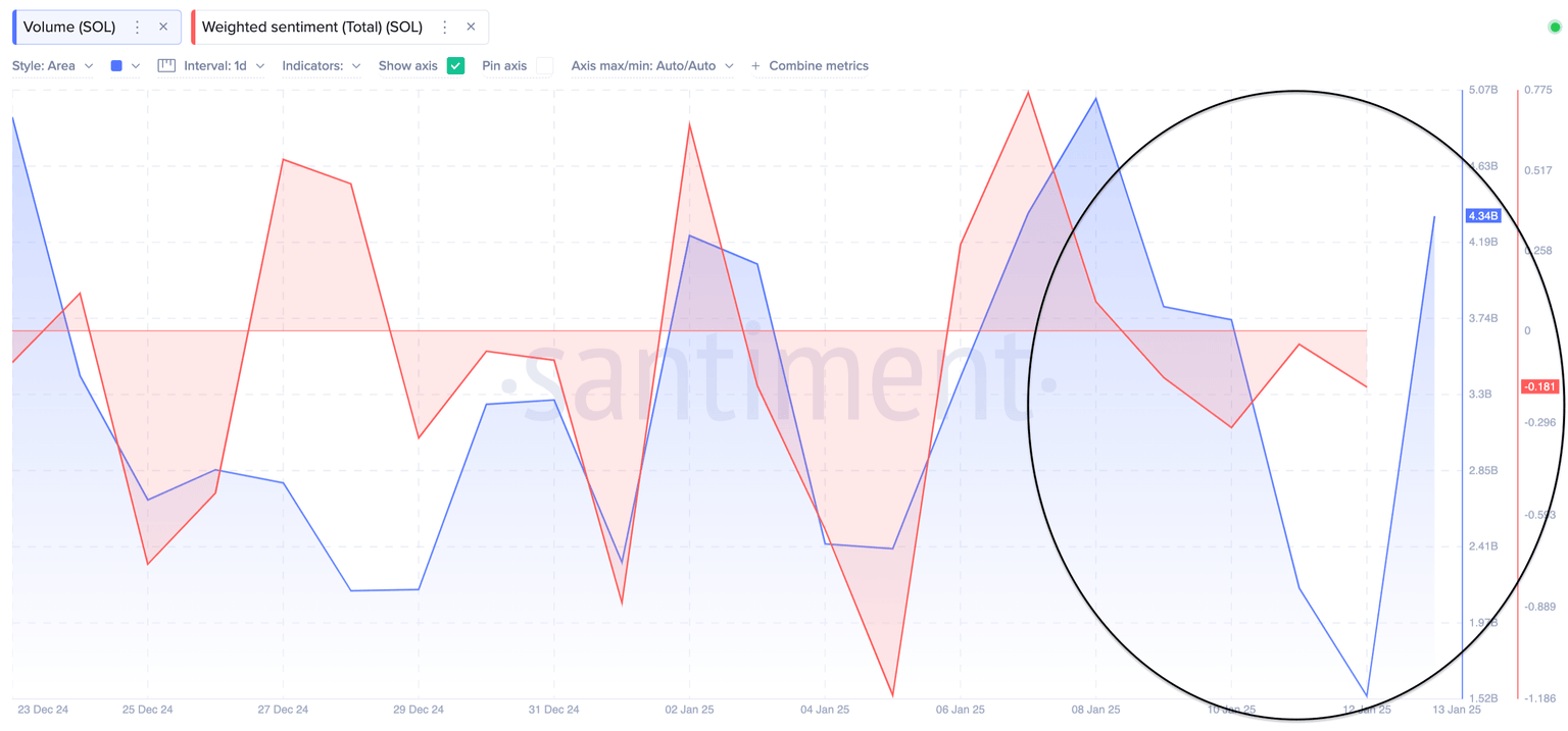 En afirmación de esta narrativa, el gráfico de Santiment a continuación compara el volumen de negociación diario de Solana con el Sentimiento Ponderado —el equilibrio entre comentarios negativos y positivos en torno a un proyecto de criptomonedas.