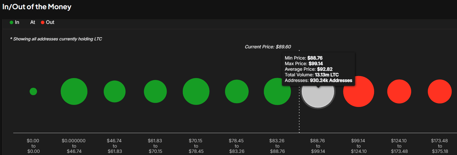 La métrica Global In/Out of the Money muestra que 95$ cae dentro del rango de demanda histórica más grande de Litecoin — 88$ a 99$ — donde los inversores compraron más de 13,13 millones de LTC, según datos de IntoTheBlock.
