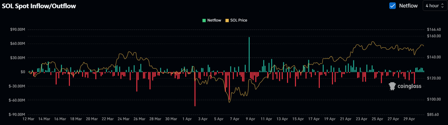 En el lado técnico, Solana ha estado consolidándose cerca del nivel psicológico de 150$ durante más de una semana después de registrar una reversión en forma de V entre el 25 de marzo y el 22 de abril. Este patrón significa una reversión alcista donde los precios caen bruscamente y se recuperan rápidamente.