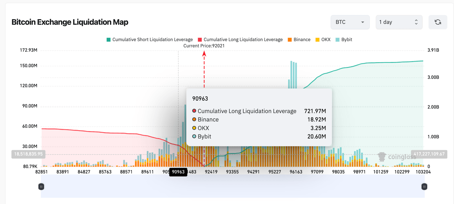 El precio del Bitcoin cayó a 91.800$ el jueves, marcando su nivel más bajo en 43 días, desde el 9 de diciembre. Los datos de los mercados de derivados muestran posiciones largas concentradas en torno al nivel de 90.000$, mientras los alcistas se mueven para detener la tendencia bajista.