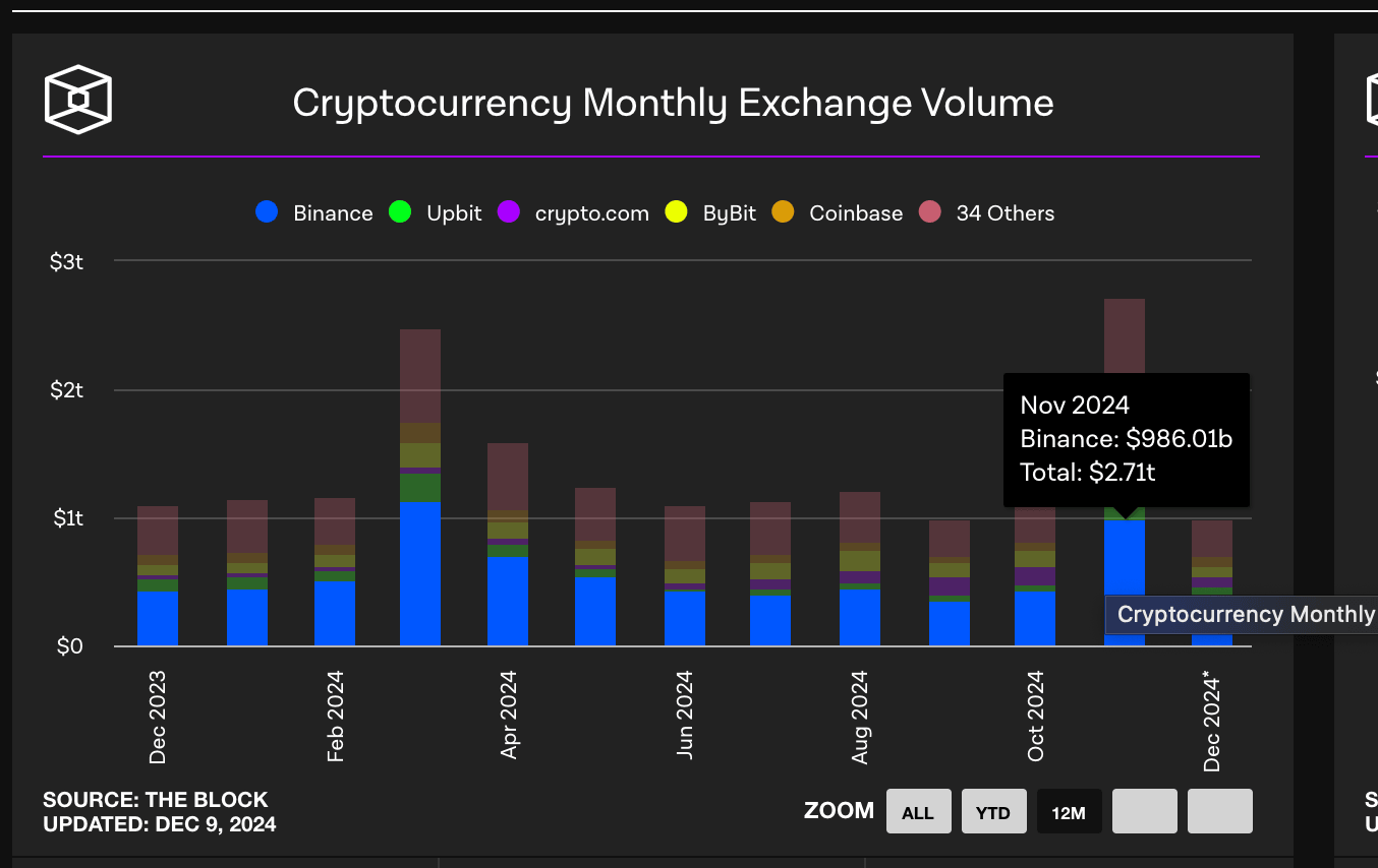 Según TheBlock, Binance ha registrado 350 mil millones de dólares en volúmenes de comercio en los primeros nueve días de diciembre, lo que lo pone en camino de superar el hito de noviembre de 986 mil millones de dólares.