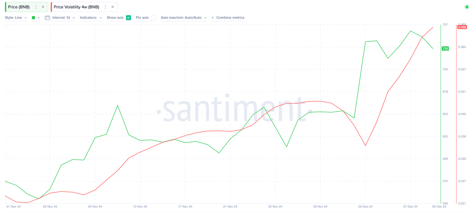 Los datos de Santiment sobre la volatilidad del precio de BNB durante un período de 4 semanas dan más credibilidad a esta perspectiva alcista.