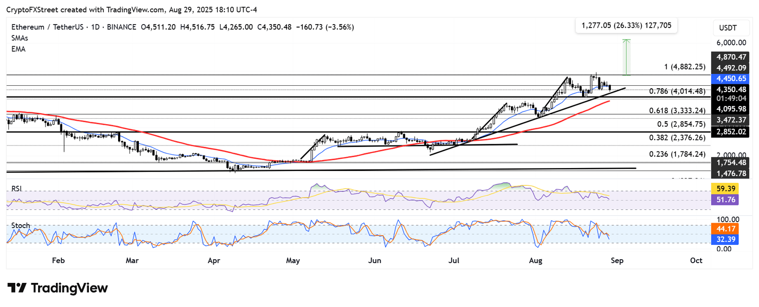 - ETH podría caer a 4.000$ si pierde un soporte clave de línea de tendencia ascendente.