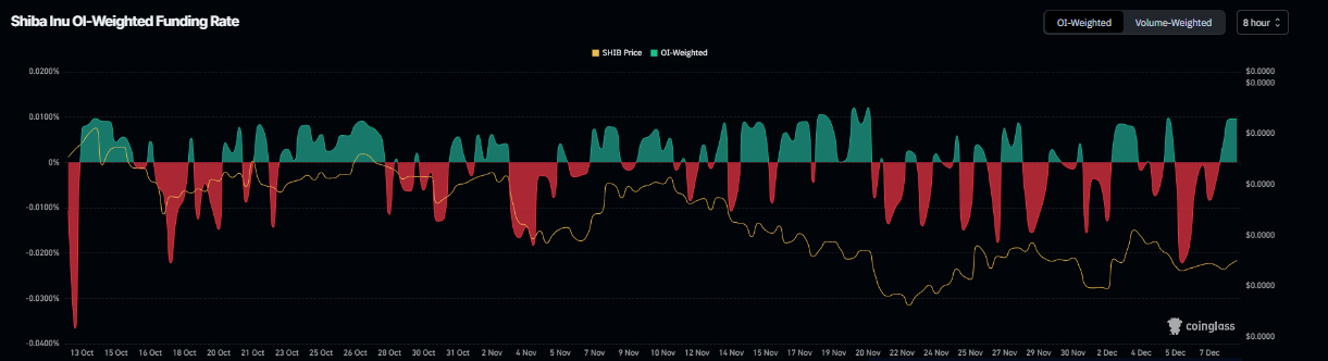 En el lado de los derivados, los datos de la tasa de financiación de Shiba Inu también apoyan señales de recuperación. Según los datos de la Tasa de Financiación Ponderada por OI de Coinglass, el número de comerciantes que apuestan a que el precio de SHIB caerá más es menor que aquellos que anticipan un aumento en el precio.