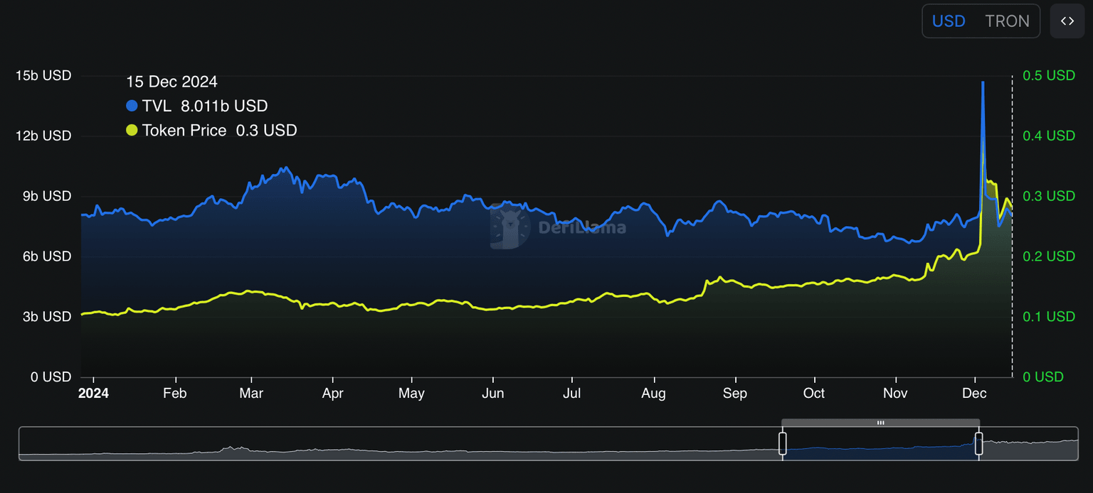 Notablemente, se ha observado una tendencia divergente entre el TVL de TRON y el precio del token durante la mayor parte de 2024. Una tendencia similar en el resto de 2025 podría prolongar la recuperación de TRX a potenciales nuevos máximos de oscilación.