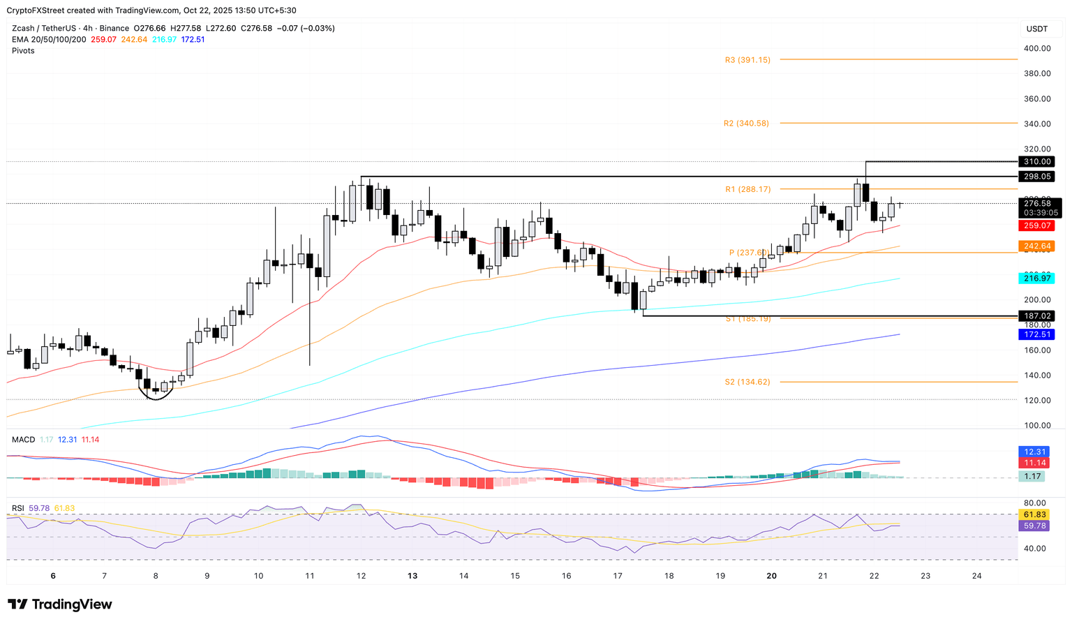 Zcash avanza un 4% en el momento de la publicación el miércoles, rebotando en la media móvil exponencial (EMA) de 20 períodos en el gráfico de precios de 4 horas. La resistencia inminente para la moneda de privacidad se encuentra en el nivel de 298$, marcado por el máximo del 11 de octubre.