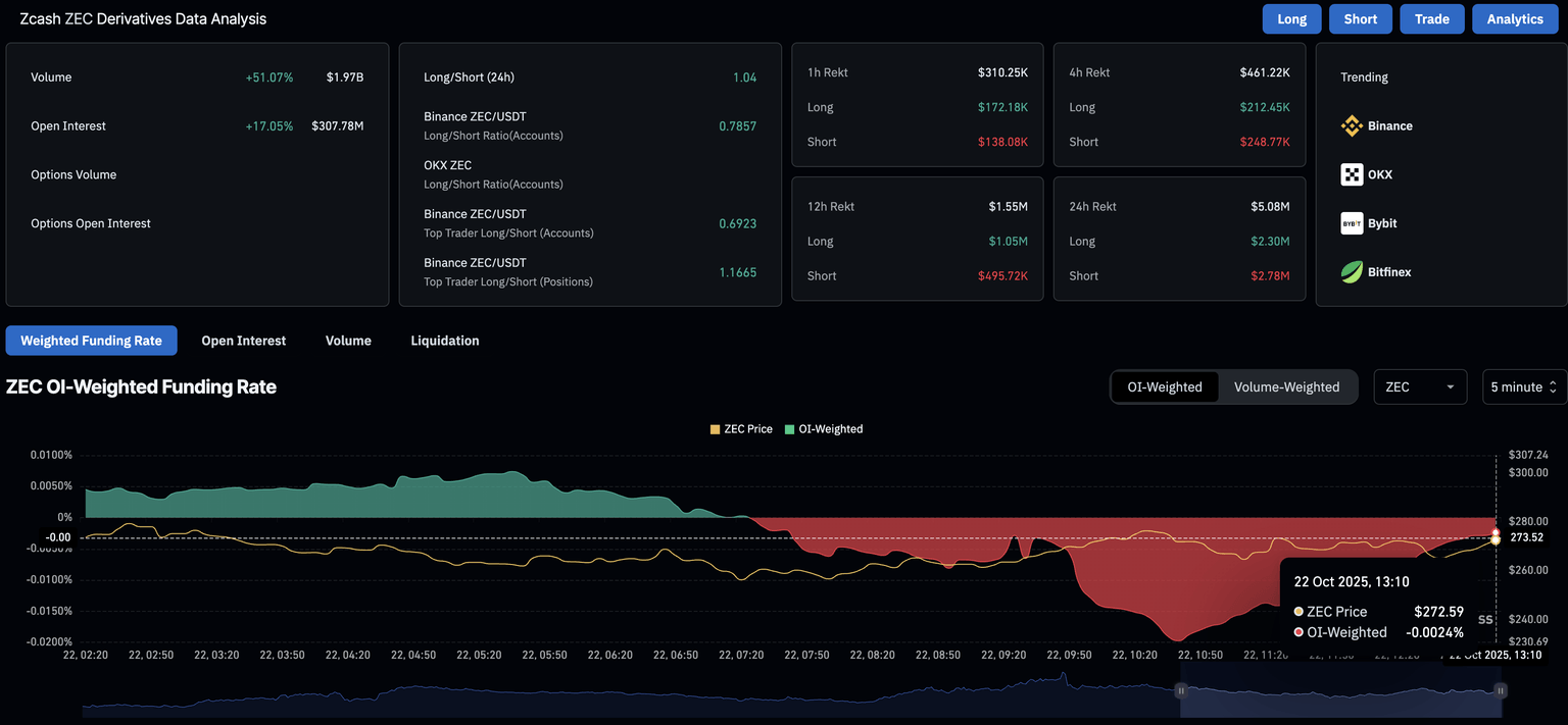 Aparte de la demanda en cadena, la demanda minorista de ZEC también está en aumento a medida que los operadores anticipan una mayor recuperación. Los datos de CoinGlass muestran que el Interés Abierto (OI) de futuros de ZEC ha aumentado un 17.05% en las últimas 24 horas, alcanzando los 307.78 millones $. Un aumento en el OI se refiere a un aumento en el valor nocional de todos los contratos de futuros de ZEC pendientes, sugiriendo un cambio en el sentimiento hacia el riesgo en la moneda de privacidad mientras el mercado más amplio sufre olas de liquidación.