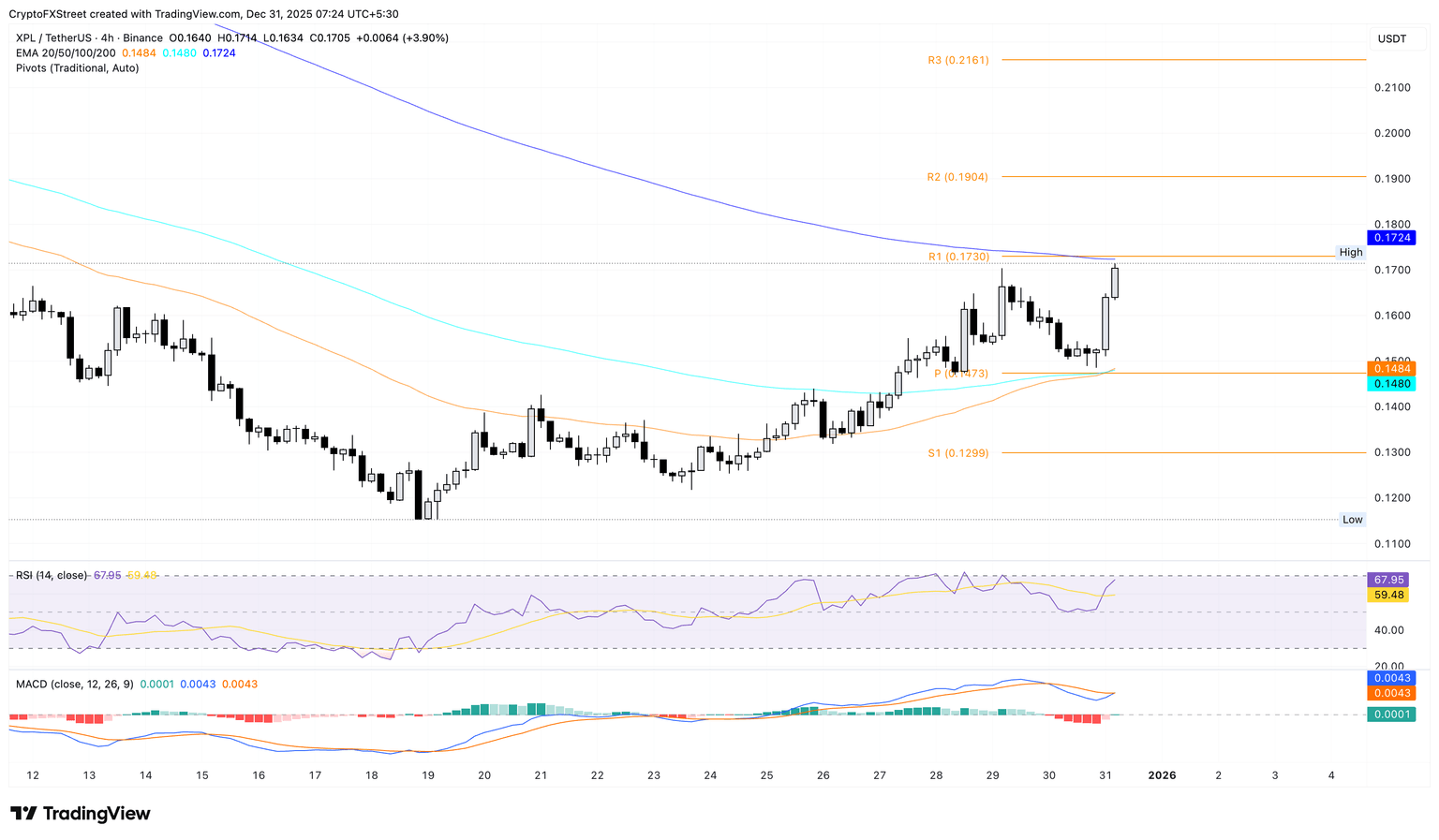 Plasma avanza un 4% al momento de la publicación el miércoles, tras un aumento del 3.60% el día anterior. El token XPL se acerca a la EMA de 200 períodos en 0.1724$ en el gráfico de 4 horas, cerca del Punto Pivote R1 en 0.1730$.