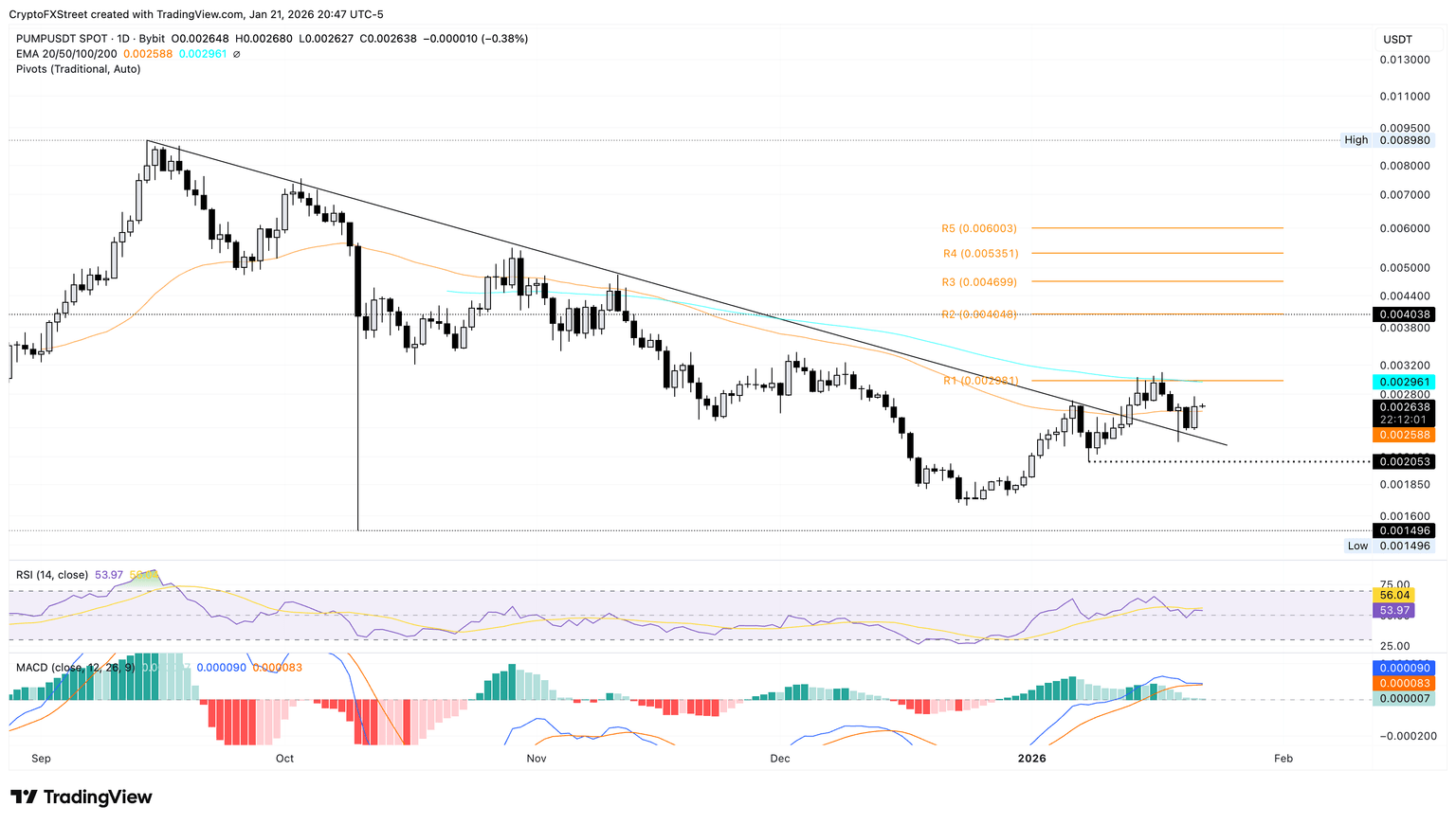Pump.fun cotiza por encima de la EMA de 50 días en 0.0025$ en el momento de la redacción el jueves, tras un rebote del 10% el miércoles. El token de lanzamiento basado en Solana apunta a la EMA de 100 días y al Punto de Pivot R1, coincidiendo cerca de 0.0029$ si la recuperación gana tracción.