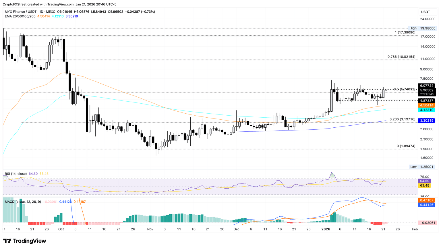 MYX Finance está extendiendo su tendencia lateral dentro de un rango de consolidación entre 4.87$ y 6.07$ en el gráfico diario. Al momento de escribir, MYX cotiza por encima de 6$, coqueteando con una ruptura del techo de 6.07$.