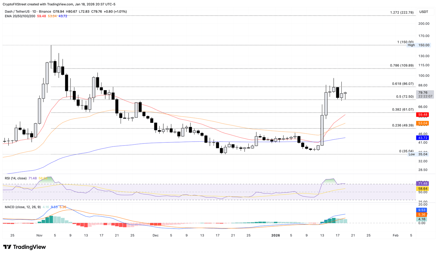 Si DASH supera los 86$, podría dirigirse al nivel de retroceso de Fibonacci del 78.6% en 109$.