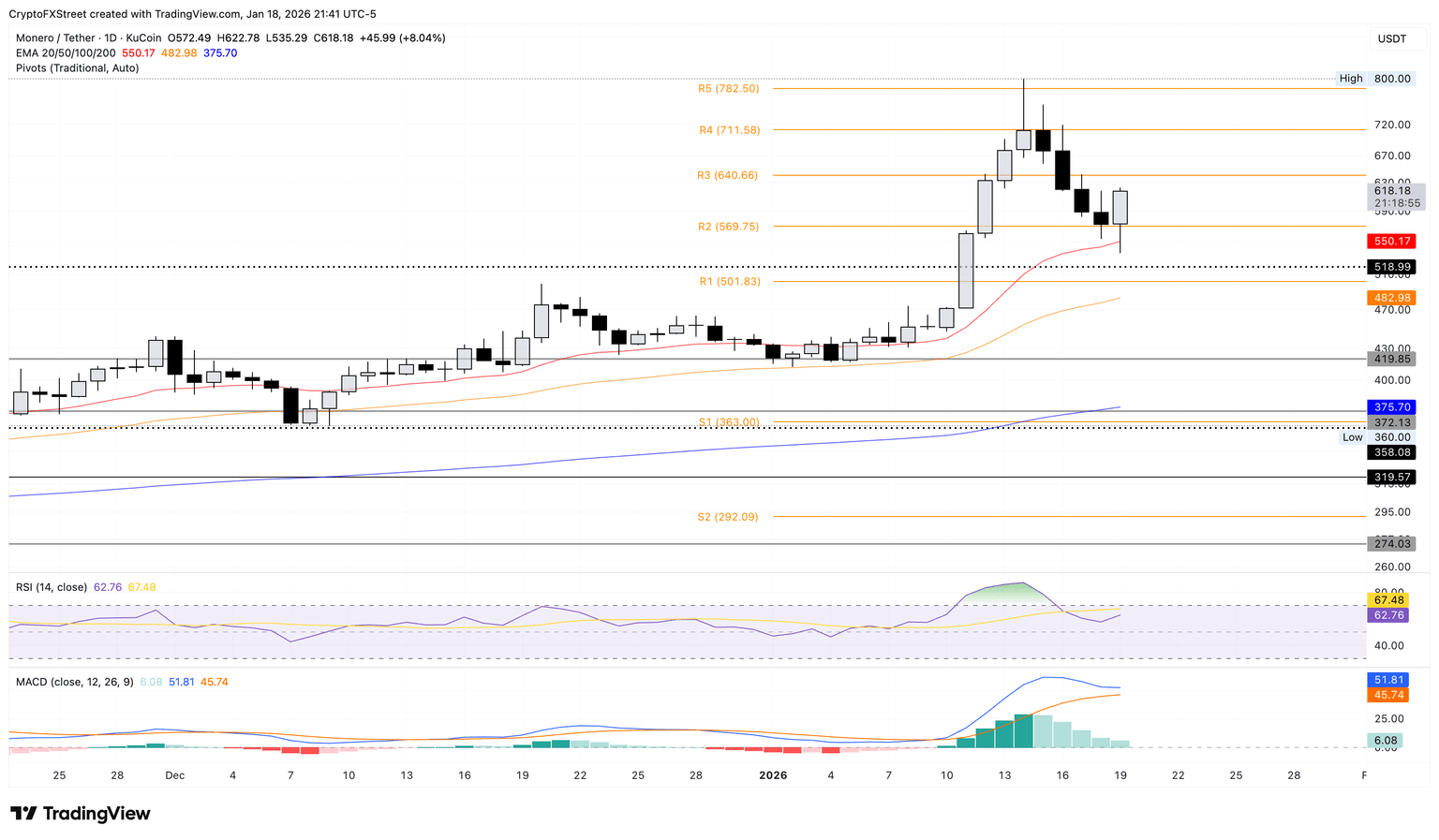 Monero supera los 600$, rebotando desde el Punto de Pivot R2 en 569$ para evitar una caída por debajo de la media móvil exponencial (EMA) de 20 días en 548$. En el momento de escribir, XMR sube un 5% el lunes, recuperándose tras una caída de cuatro días del 20% desde aproximadamente 700$, como se pronosticó anteriormente por FXStreet.