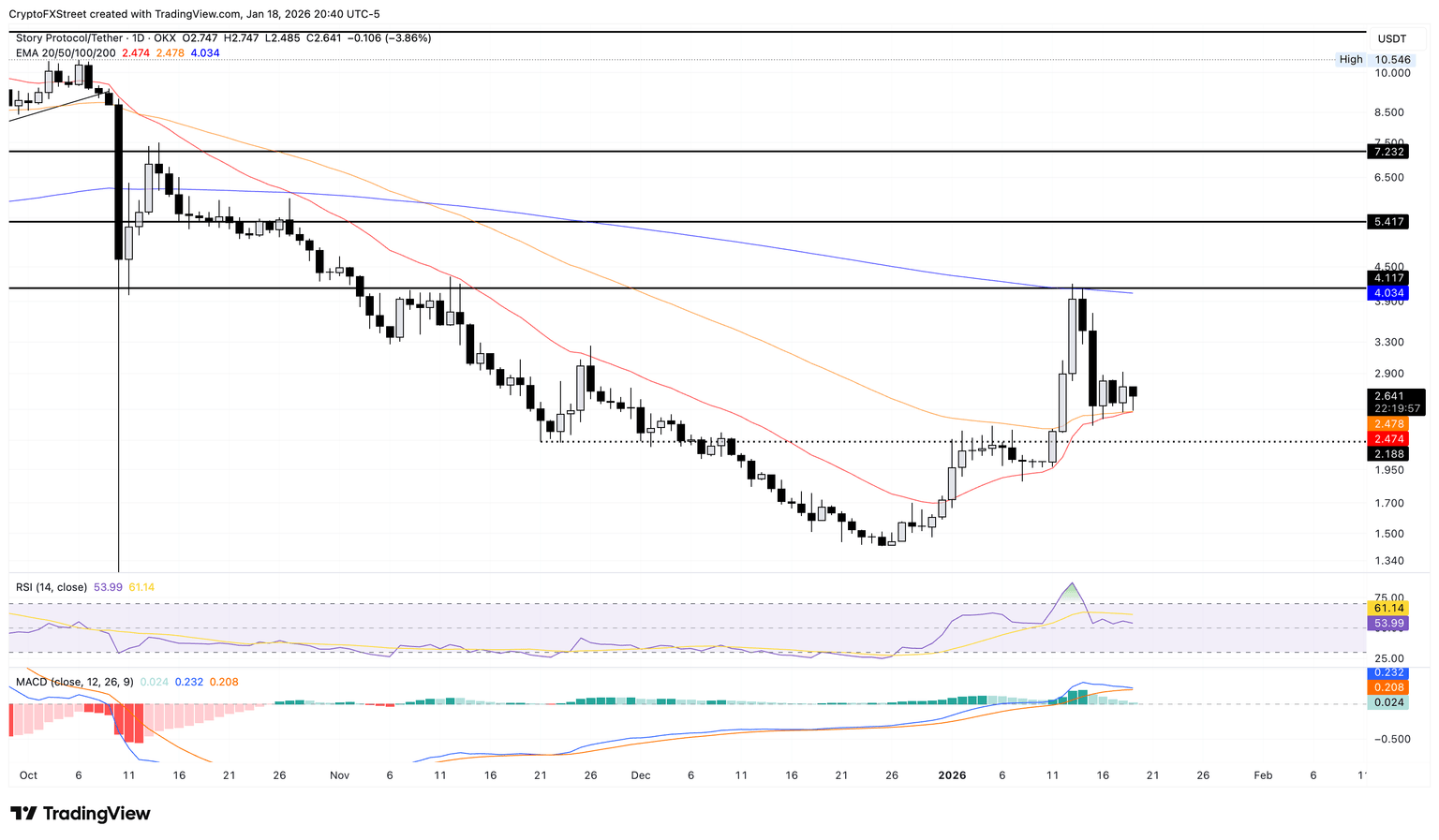 Story está cayendo aproximadamente un 4% en el momento de la redacción el lunes, comenzando la semana con una nota bajista tras el aumento del 7% del domingo. La moneda meme se consolida por encima de 2.50$, mientras que la EMA de 20 días en ascenso converge con la EMA de 50 días en 2.47$, preparando un posible cruce. Tal cruce indicaría una renovada fuerza en la recuperación a corto plazo.