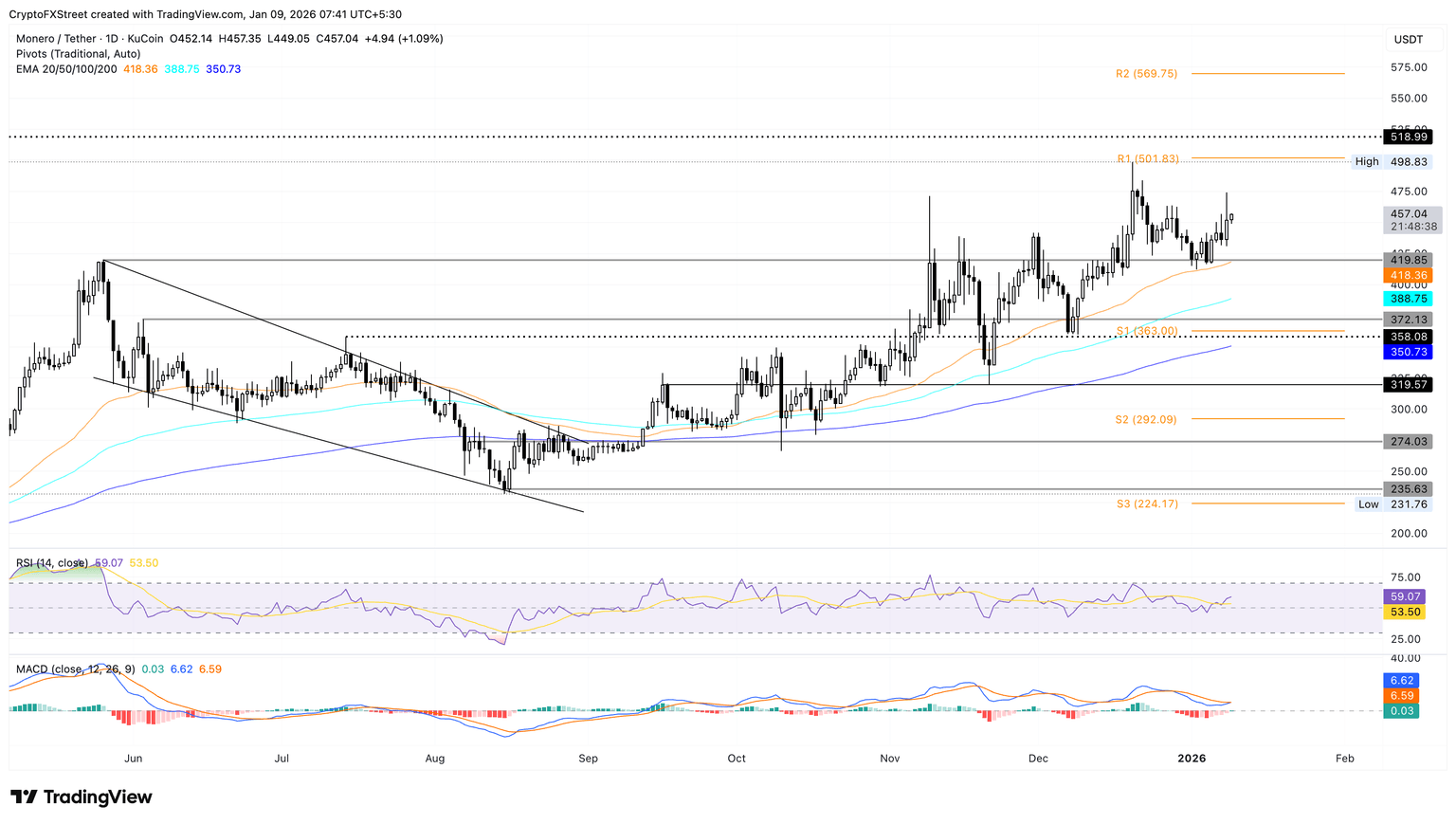 - Monero cotiza por encima de 450$ después del aumento del 3% del jueves, estirando el rebote desde la EMA de 50 días.