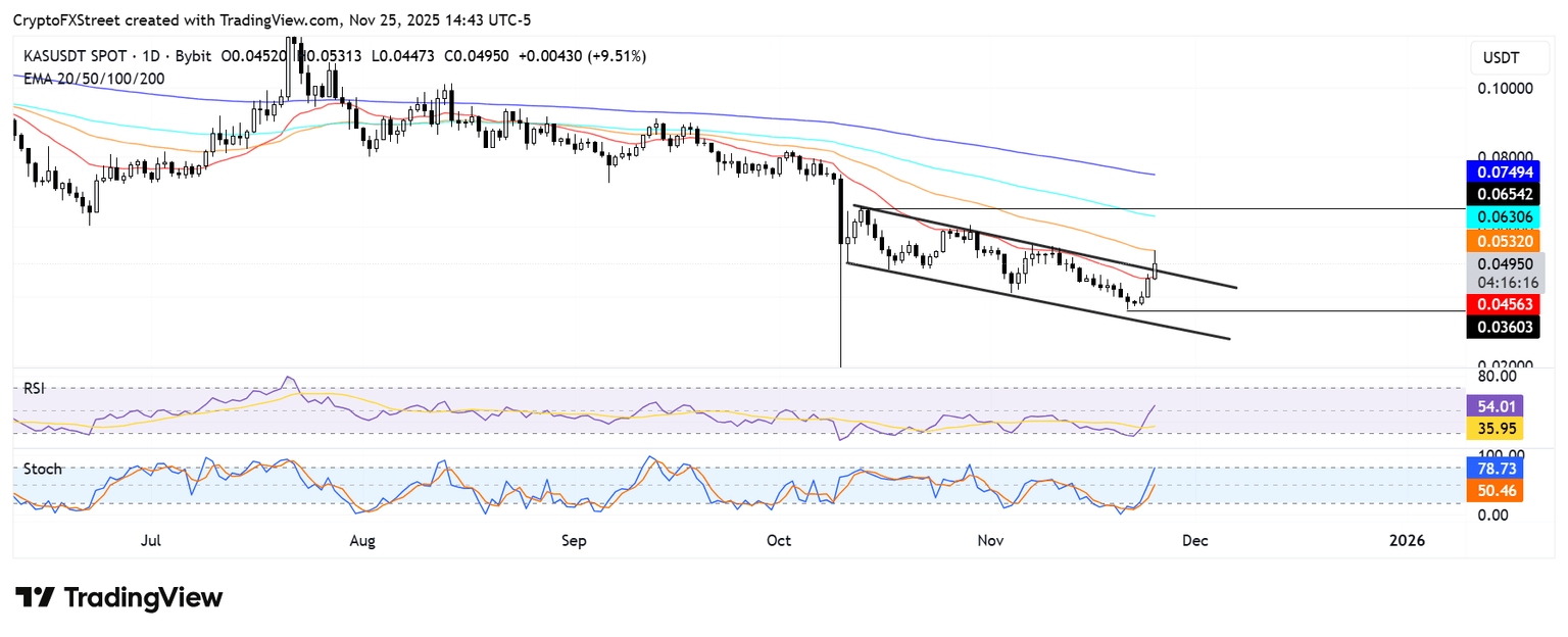 En la parte baja, KAS podría encontrar soporte en 0,036$ si no logra mantenerse por encima del límite superior del canal.