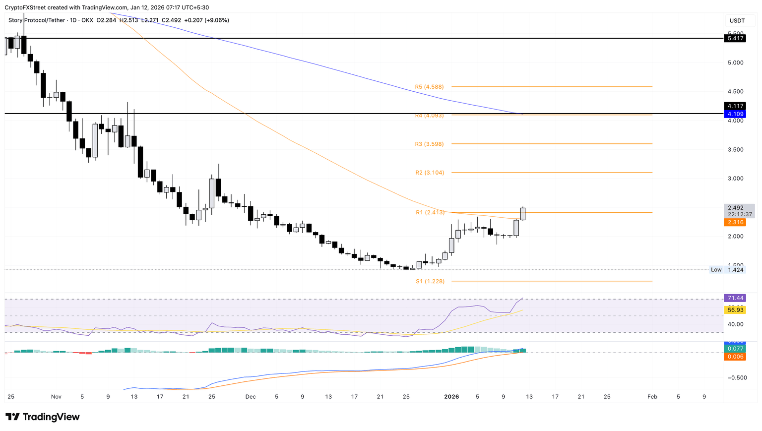 Story gana un 9% al momento de la publicación el lunes, extendiéndose por encima de la Media Móvil Exponencial (EMA) de 50 días en 2.31$ después del salto del 13% del domingo. La moneda meme ha superado el Punto Pivote R1 en 2.41$ y se acerca a 2.50$.
