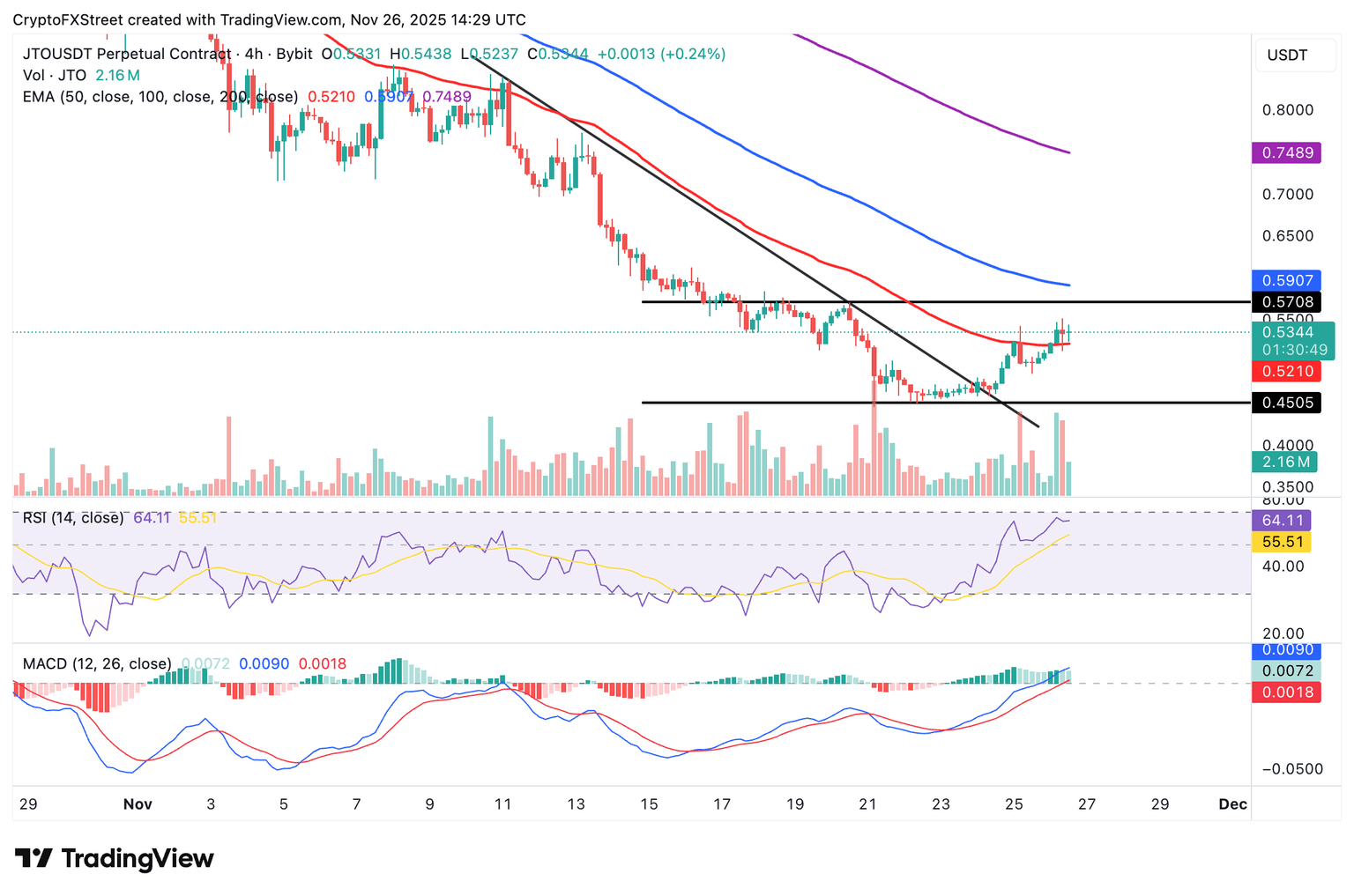 - Jito se eleva por encima de la EMA de 50 en el gráfico de cuatro horas, respaldado por una señal de compra del MACD.