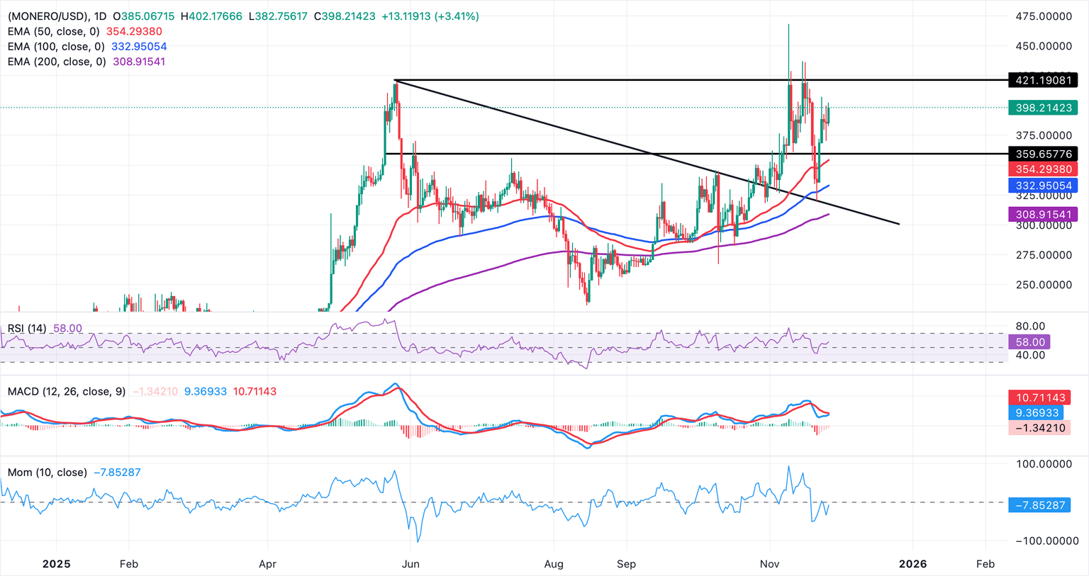 Monero se cotiza a 398$, ya que el precio se mantiene por encima de la media móvil exponencial (EMA) de 50 días en 354$, la EMA de 100 días en 332$ y la EMA de 200 días en 308$, todas las cuales sostienen un sesgo técnico alcista.