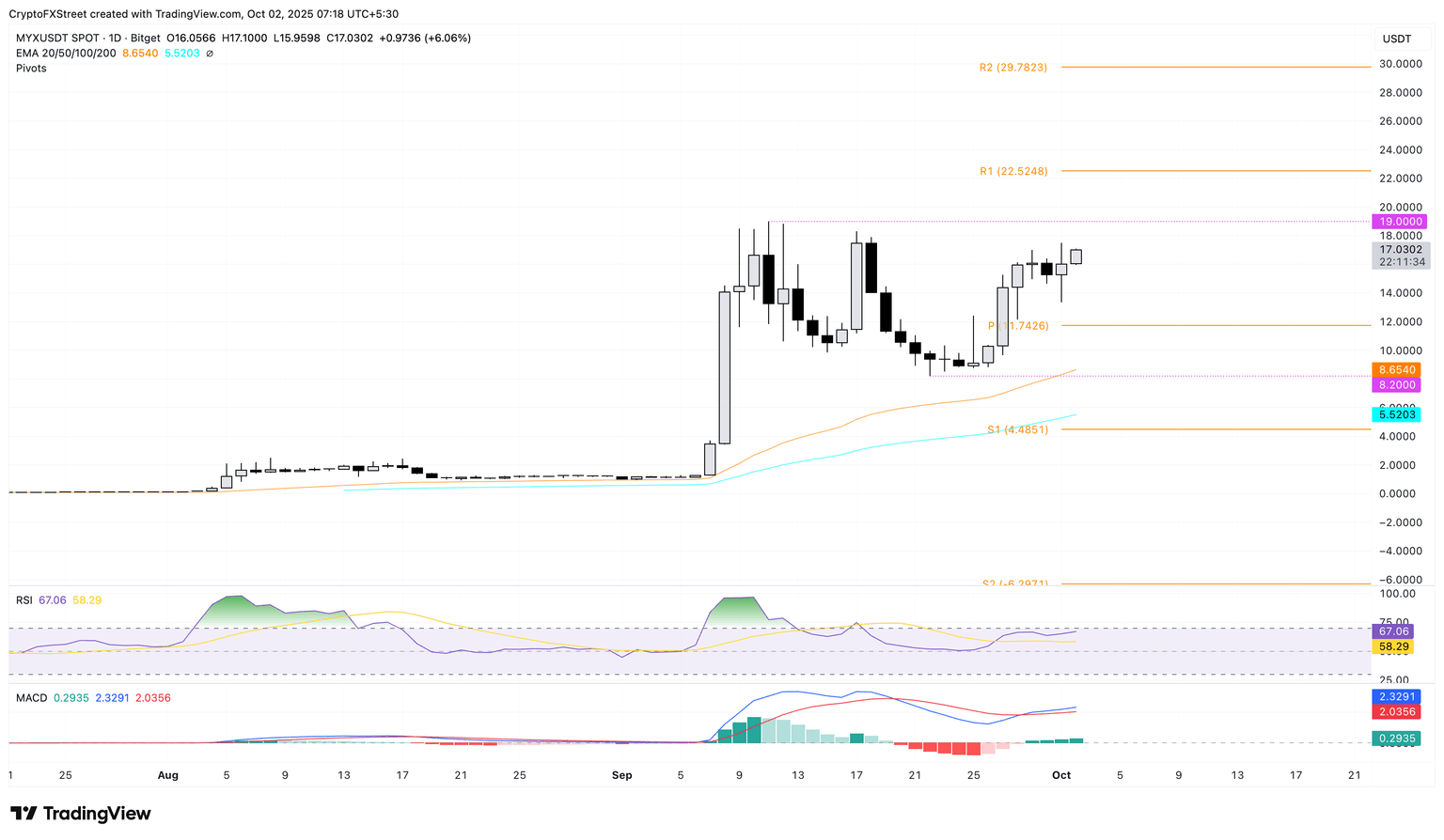 MYX Finance extiende la reversión desde el mínimo de 8.20$ el 22 de septiembre, acercándose a su máximo histórico de 19.00$. En el momento de escribir, MYX ha subido casi un 3% el jueves tras las ganancias del 5% del día anterior.