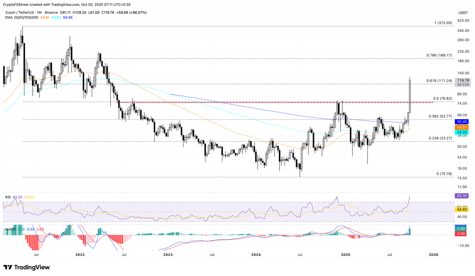 ZEC supera el nivel de retroceso de Fibonacci del 61.8% en 111$, retrocedido desde el máximo de 372$ en mayo de 2021 hasta el mínimo de 15$ en julio de 2024. Un cierre decisivo por encima de este nivel podría extender el repunte hasta el nivel de retroceso de Fibonacci del 78.6% en 189$.