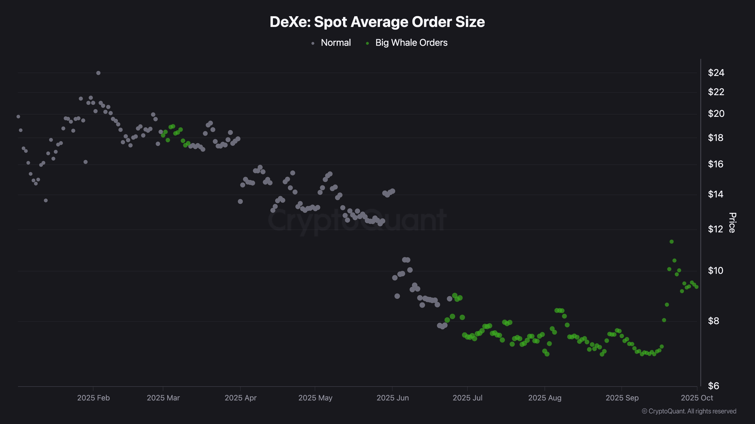 Tamaño promedio de órdenes al contado de DeXe. Fuente: CryptoQuant