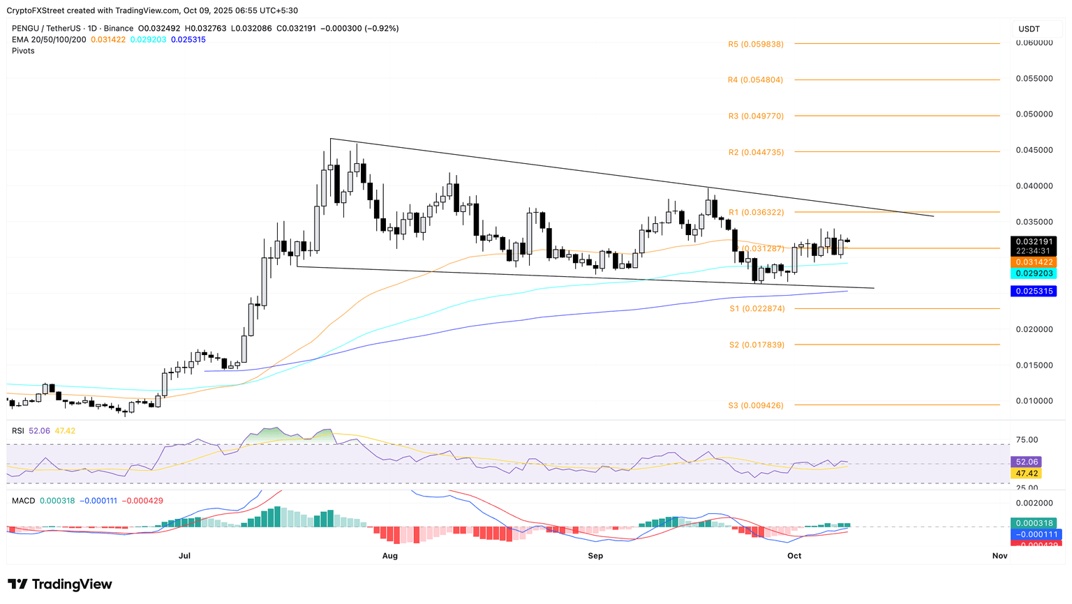 - Pudgy Penguins se consolida cerca de la EMA de 50 días dentro de un patrón de canal descendente.