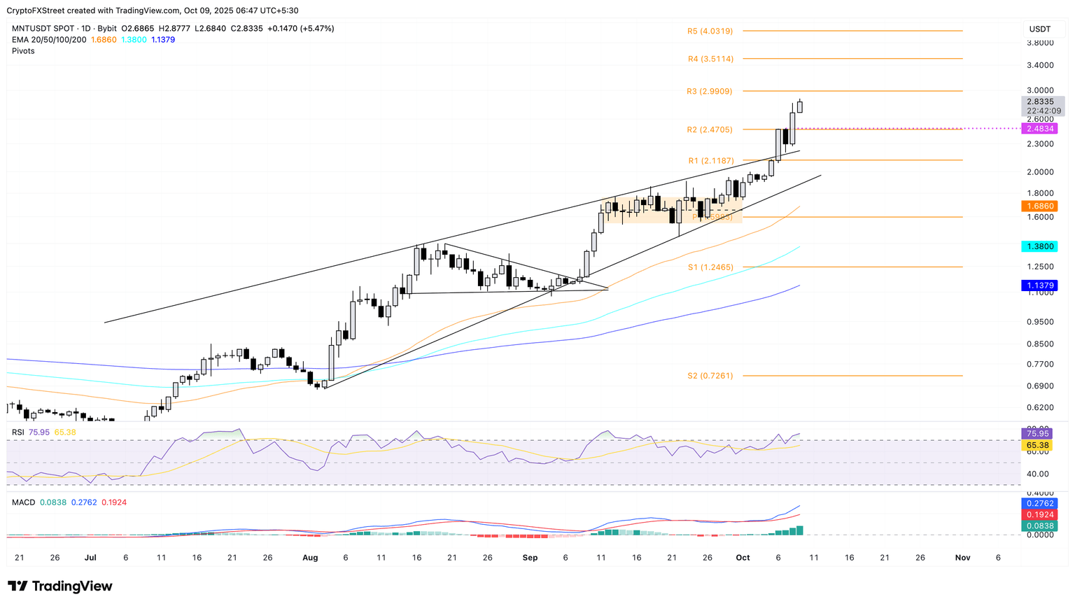 Mantle avanza un 5% al momento de la publicación el jueves, tras el salto del 17% del día anterior. El rally de MNT se acerca al nivel del Punto Pivote R3 en 2.99$ como la siguiente resistencia clave.
