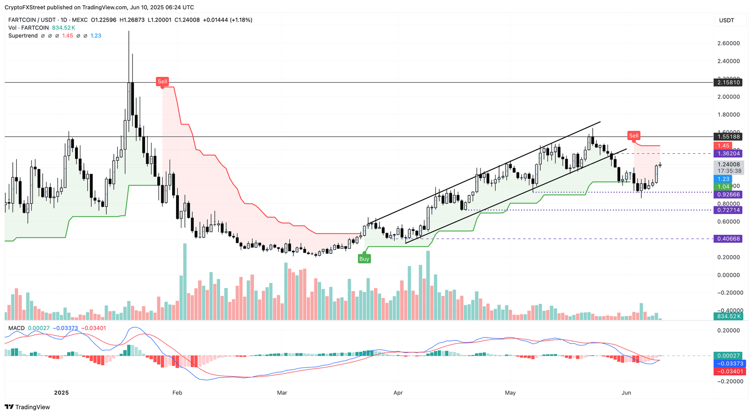 Aún así, según el indicador Supertrend, la ruptura del canal ascendente en mayo llevó a una tendencia bajista. Para restablecer una tendencia alcista, Fartcoin debe superar la línea del indicador en 1.45$, una posible señal de compra para los operadores de tendencias.